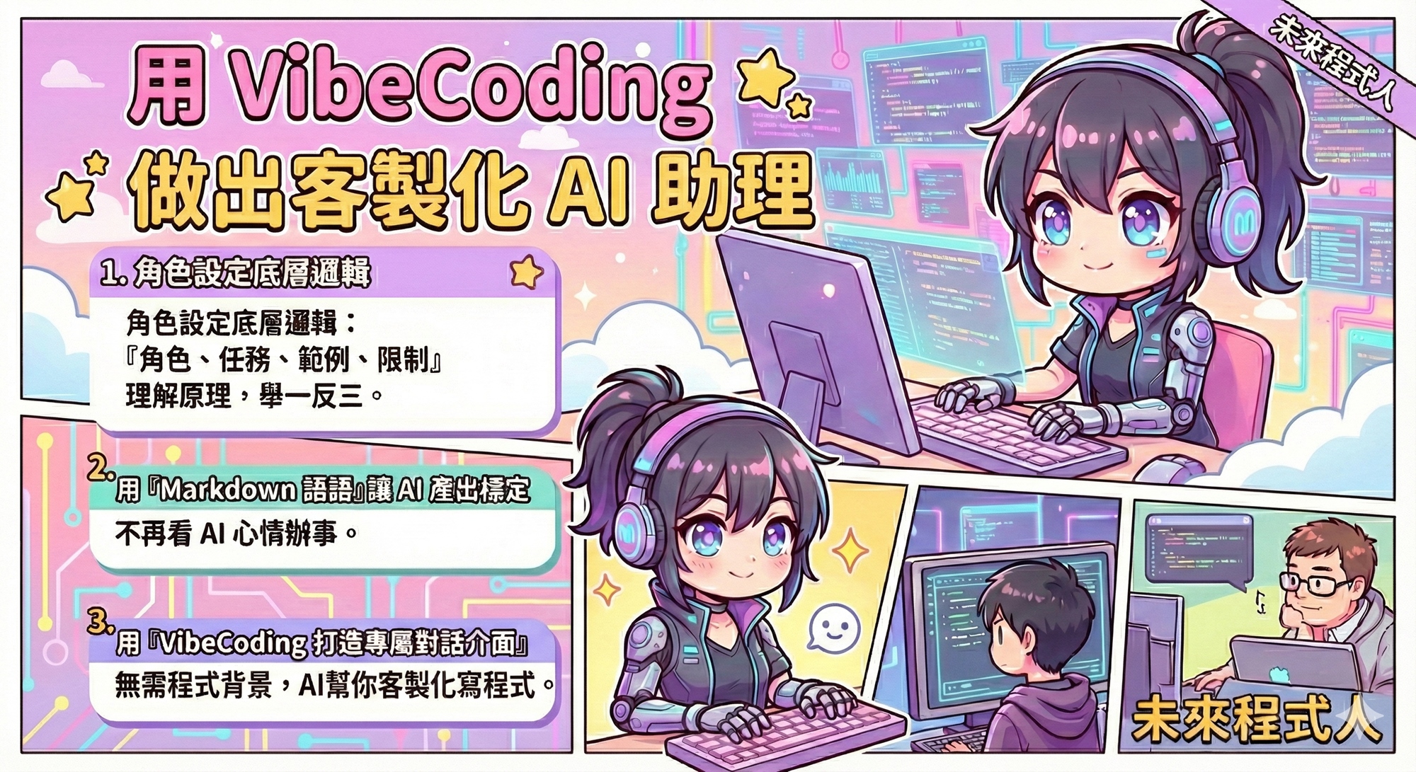 除了學到通用的角色設定技巧,及用 Markdown 語法解決產出不穩定問題,還能用 VibeCoding 做出你想要的聊天對話介面。