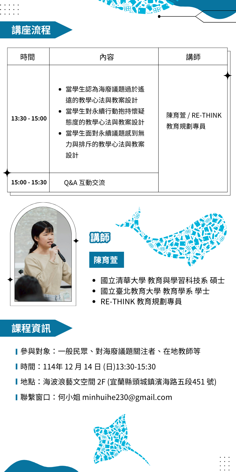 RE-THINK 長期深耕海洋環境教育,從淨灘現場、海廢圖鑑、海廢議題教材包,到循環經濟桌遊與多元教案,都累積了超過數百場的教學與研習經驗,陪著全台上萬名師生一起認識海廢背後的生活樣貌。這場講座中,講師會分享在各種情境下的海廢教案設計重點與教學心法,以及如何運用 RE-THINK 的教具與教材資源,讓你一次帶走從「理解議題」到「設計行動」的完整教案。