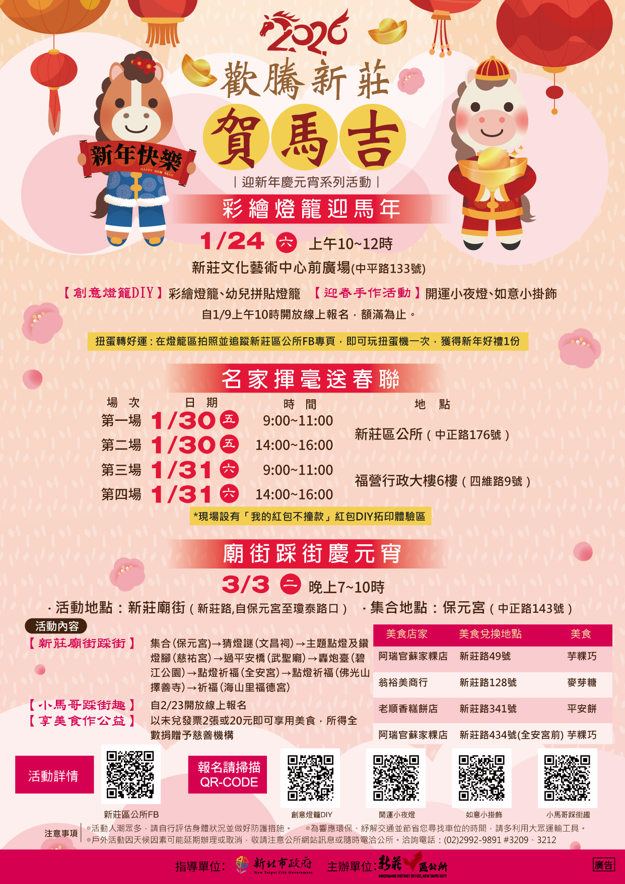 1.1/24彩繪燈籠活動,與燈籠拍照區合影,並追蹤新莊區公所FB專頁,即可玩扭蛋機一次,獲得新年好禮1份。同一帳號不可重複領取。