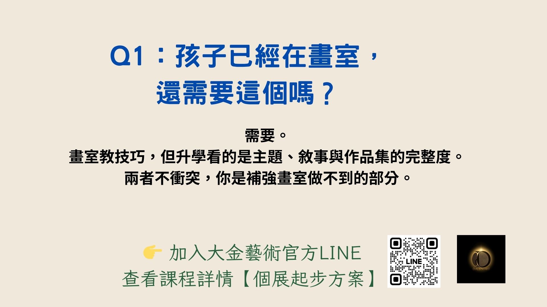 試點版為 6 週。若需要更多產出,可加購展覽模組。Q:孩子已在畫室學畫,為什麼還需要這個?
