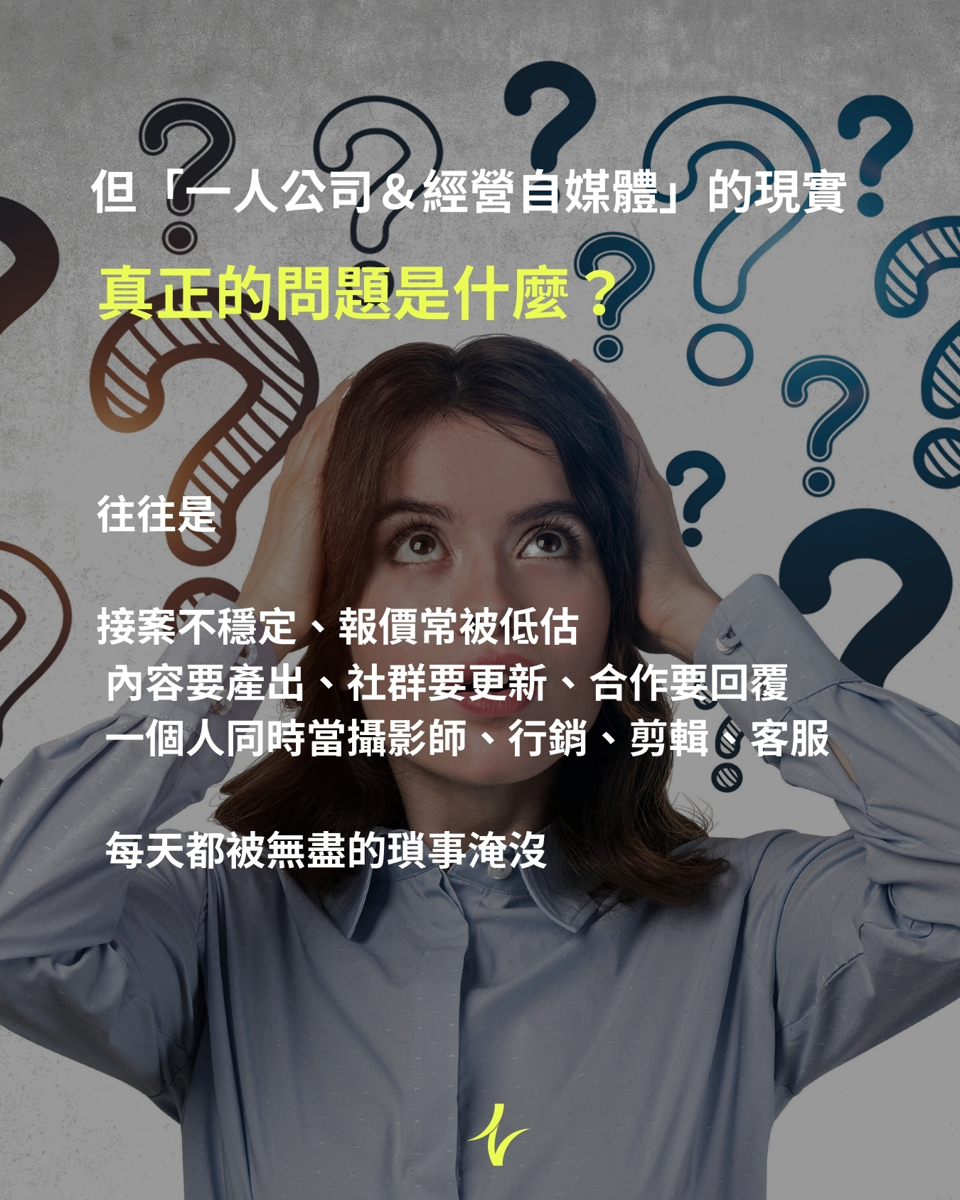 人人都能成為創作者的時代,你已經擁有了不起的技能,也渴望實現「地點自由」與「收入穩定」的生活。但現實的一人公司往往是另一回事——接案不穩定、報價常被壓低、每天忙在剪片、修圖、排程、回覆訊息與行政瑣事,根本沒有時間經營自己