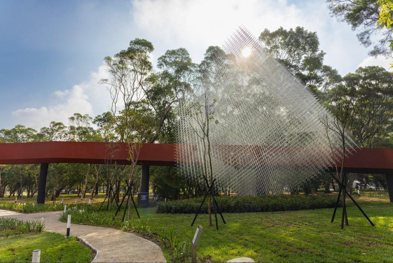 迎著青青綠林,幾何美的建築線條,層疊無盡的湛紅,輝映林口紅土沉積紋理,檔案蘊藏歲月流變的韻味宛若其中,烤漆玻璃鑲嵌霧面不銹鋼外觀,隨著光影映襯國家記憶開放透明,繫自戶外園區的「綠林坡道」、「以霧為景」鋼構藝術及波光迎目的「曦月池」,倍感建築的宏美與園區自然寫意,佇足「林梢廣場」回望來時行跡,蹤影冉冉如館藏記憶引人探尋。