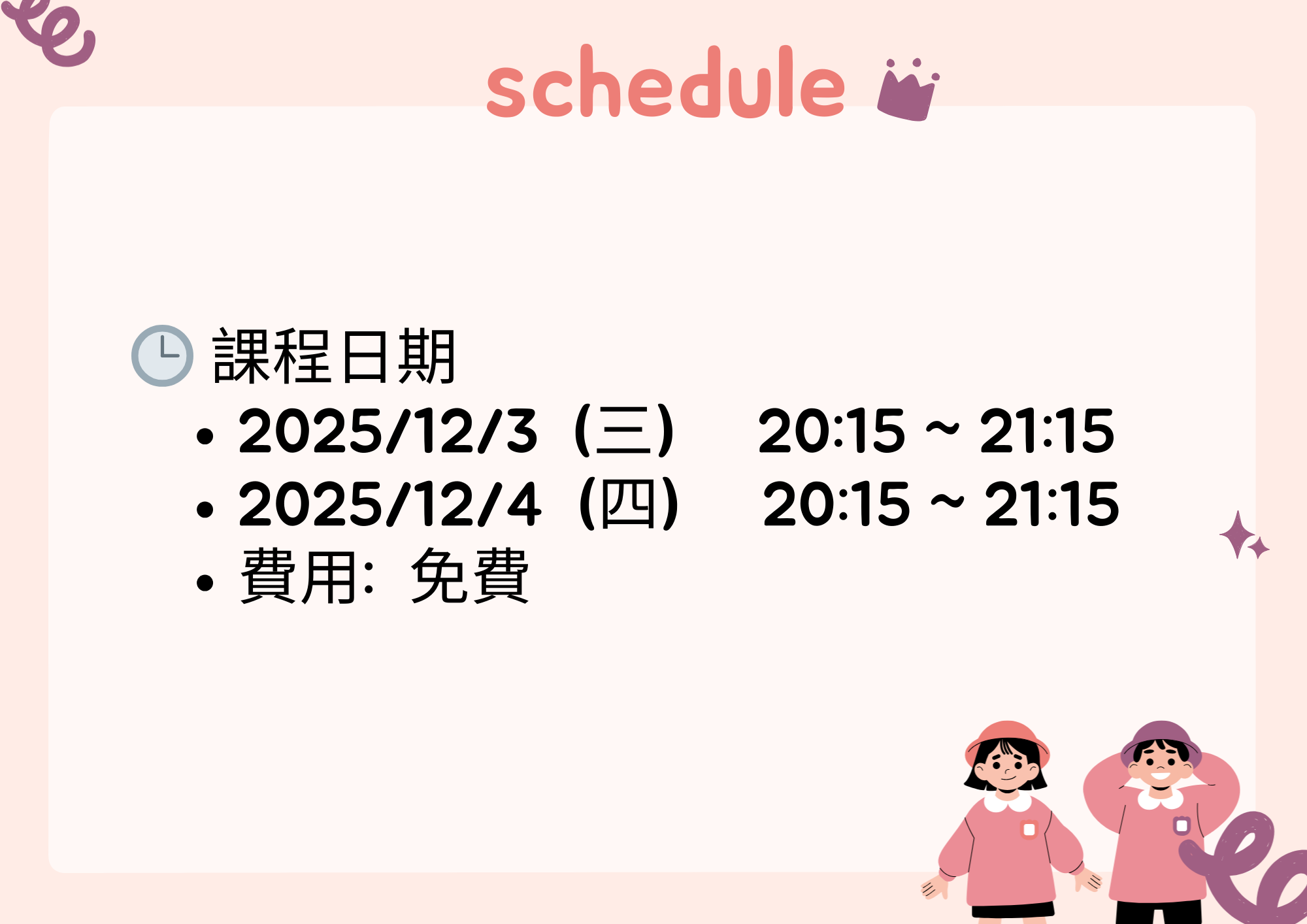 🕒 課程日期(兩個場次內容為一樣的喔! 建議可以擇一參與,當然你想跟老師多互動也可以~)