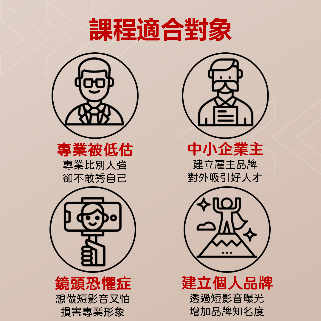 建個人品牌:想透過短影音曝光,增加品牌知名度的職場工作者,創業者與企業主。