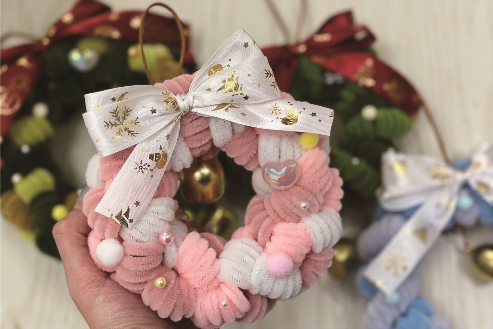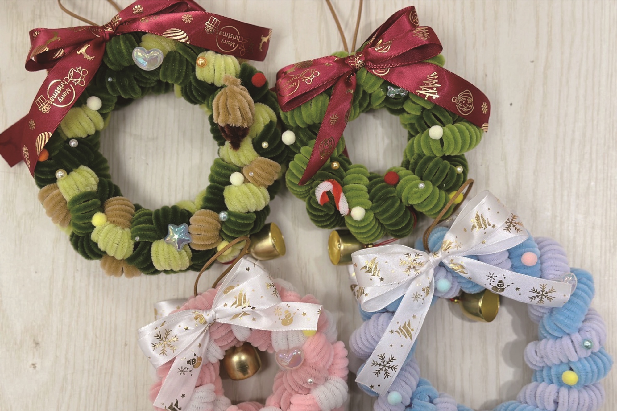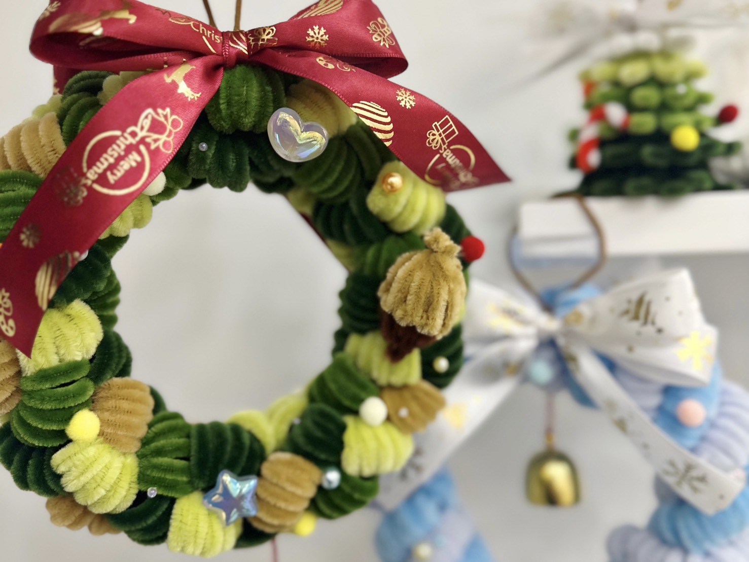 只需運用扭扭棒纏繞即可完成一個毛絨聖誕花圈、配色豐富,還有聖誕樹掛飾等作品可以完成帶回家