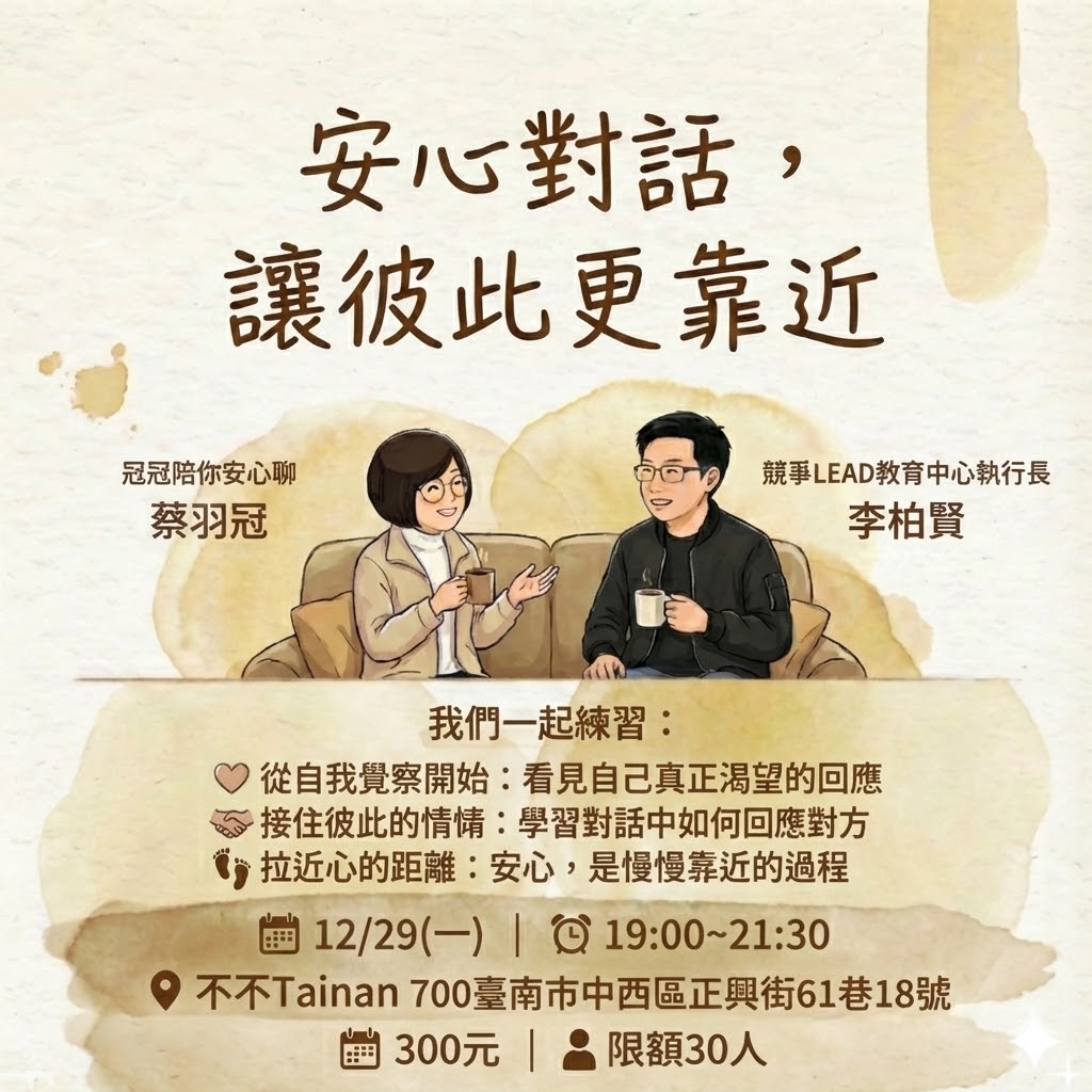 僅需 $300 元,就能進入台南知名空間「不不Tainan」,享受兩小時半的深度交流。在 限額 30 人 的精緻團體中,你不會被淹沒在人海裡,而是能獲得更深度的互動與練習。對於想整理心境、為新的一年儲備能量的人來說,這是非常值得的投資。