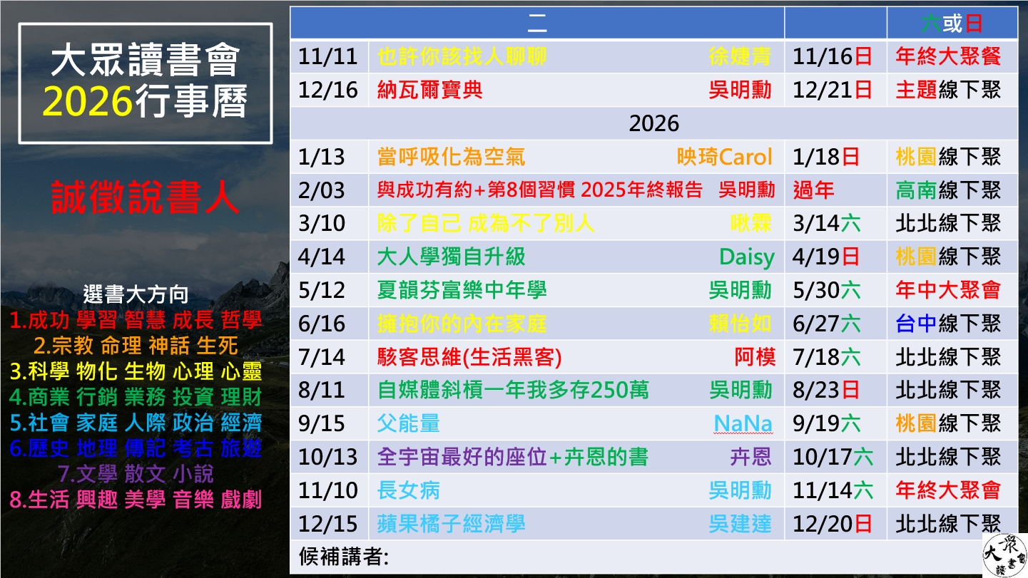 線上讀書會(免費)每月晚上1930~2030(實際時間看講者)