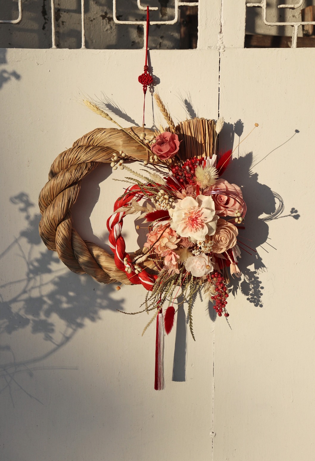 在新年的門前掛上一圈花,