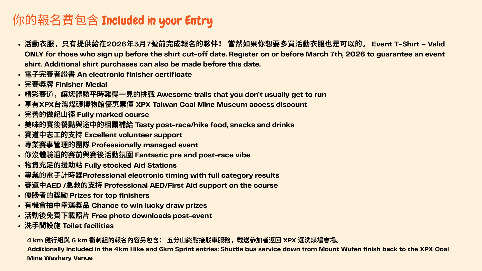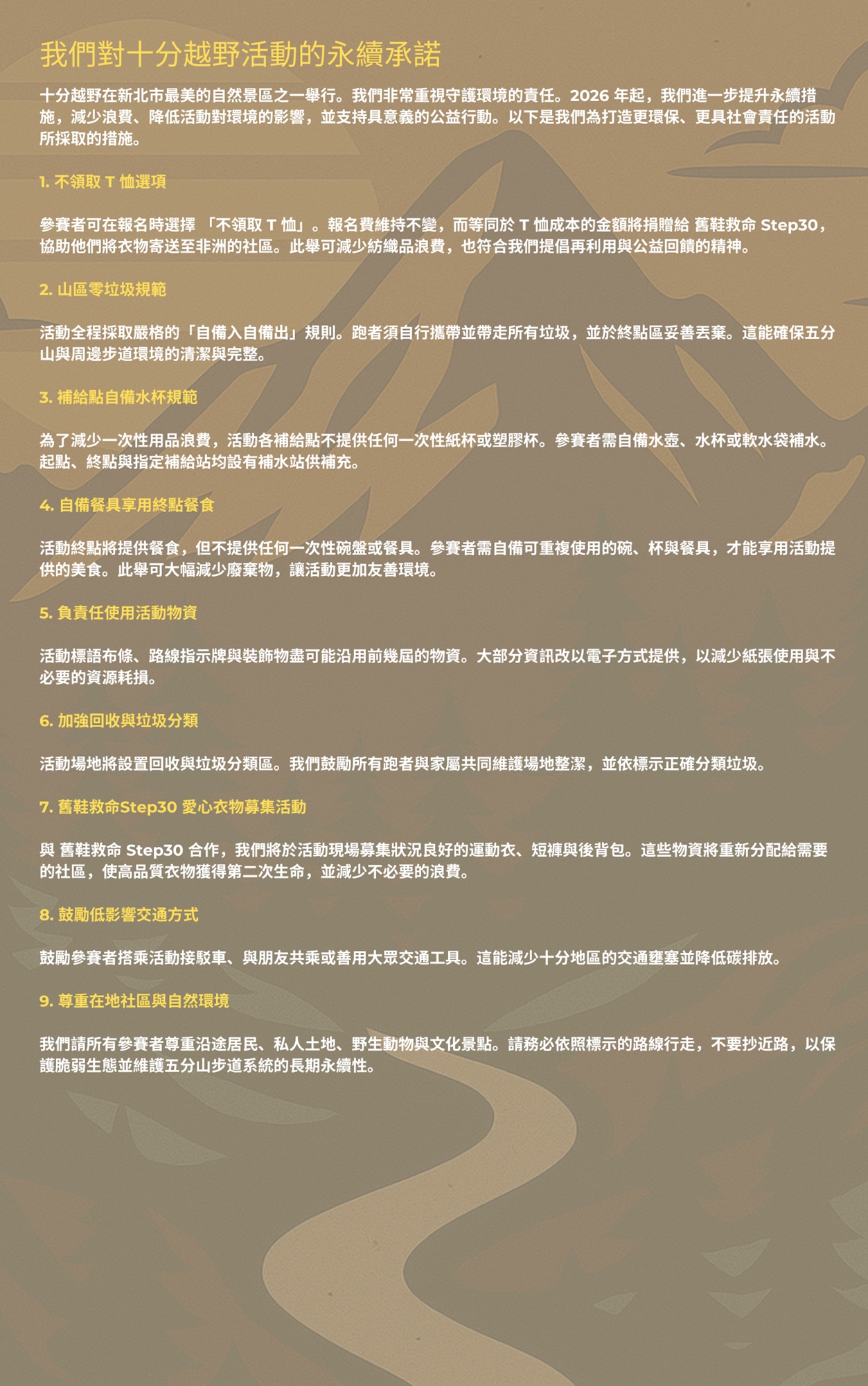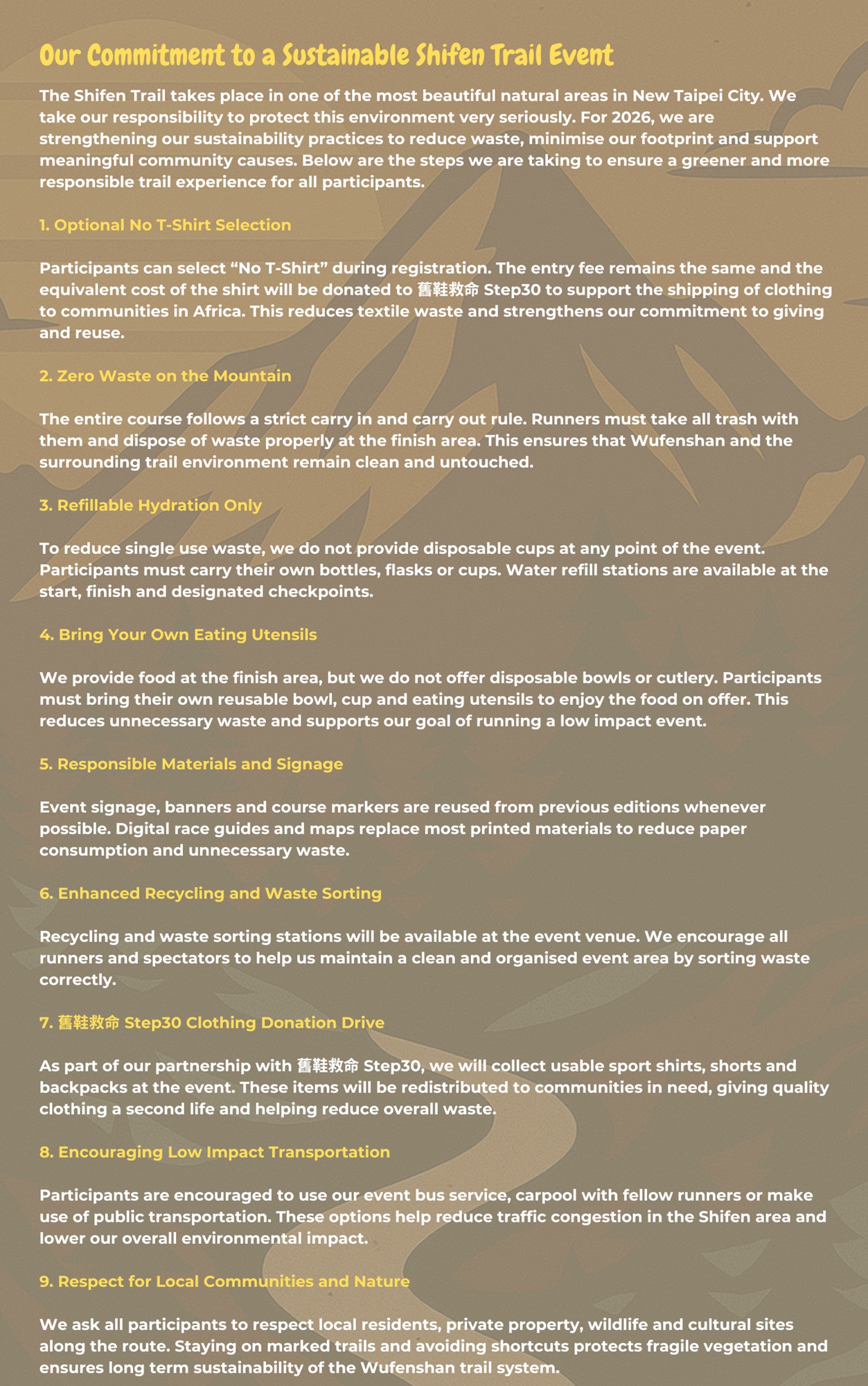 國際參與者應在抵達台灣之前購買此越野跑活動的旅行保險。
