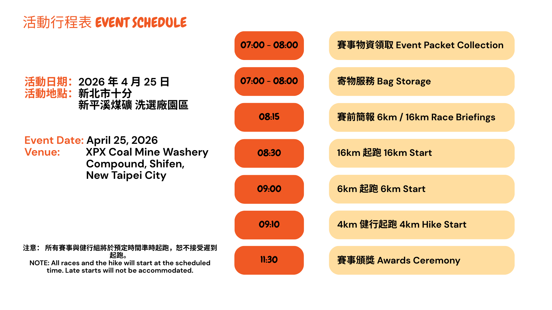- The inability to ensure runners safety due to in the event of an earthquake, hurricane/typhoon, flood, landslides, incidents, accidents, epidemics and/or pandemics. The race organizer reserves the right to make judgments and decisions regarding the shortening/canceling of the race.