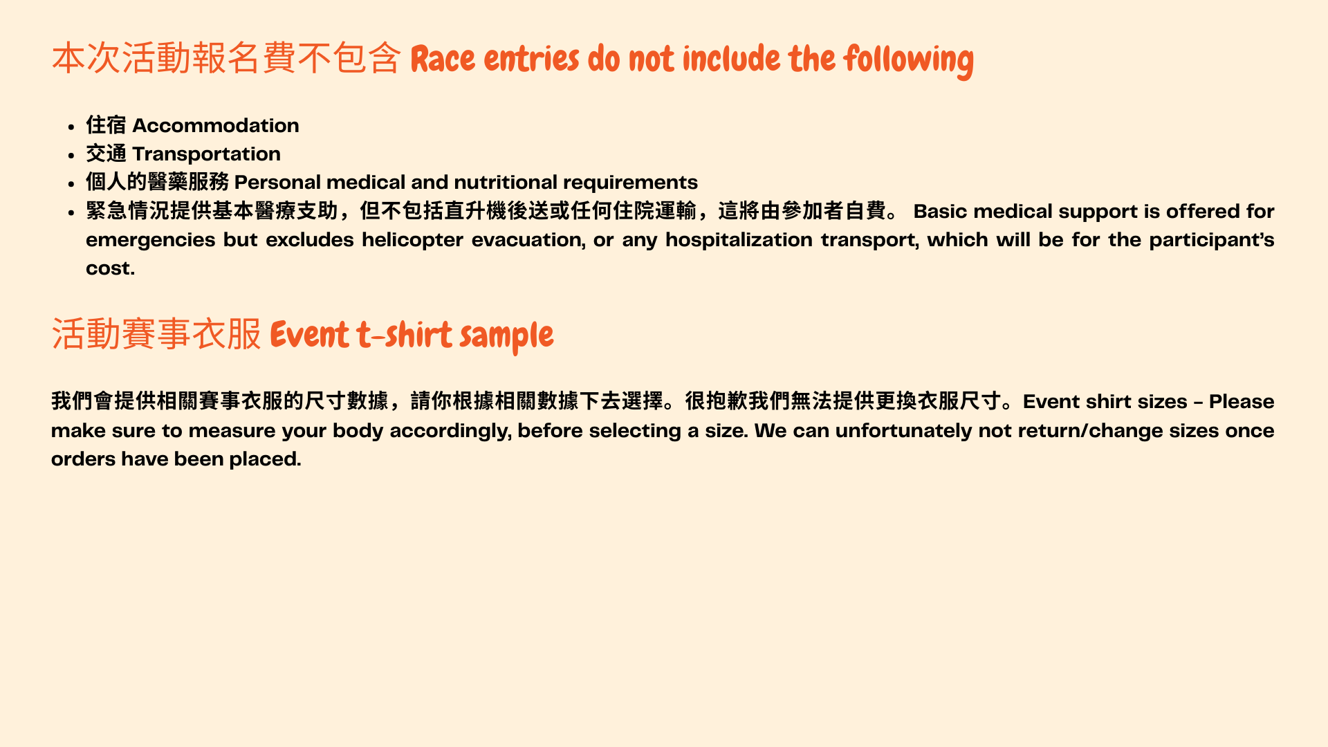 我們建議您在參加此活動/賽事之前自行購買個人意外保險、救護保險和收入保護保險,以應對因參加活動/賽事而可能產生的意外個人費用,包括救護費、醫療費用或因受傷而需要請假的情況。