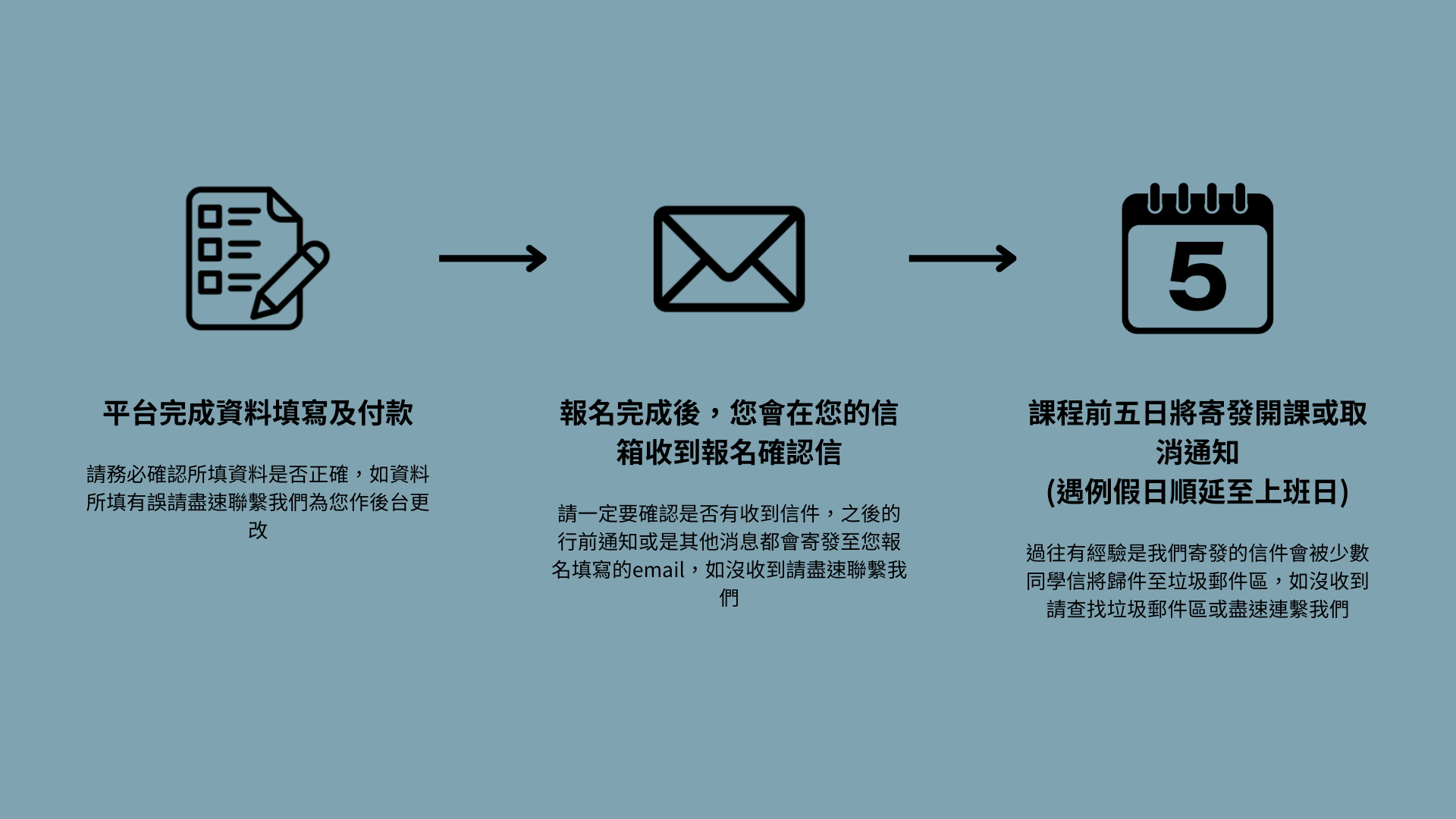 4. 報名時請再次確認填寫資料是否正確,開課、取消或其它資訊將以「email」或「手機簡訊」通知。