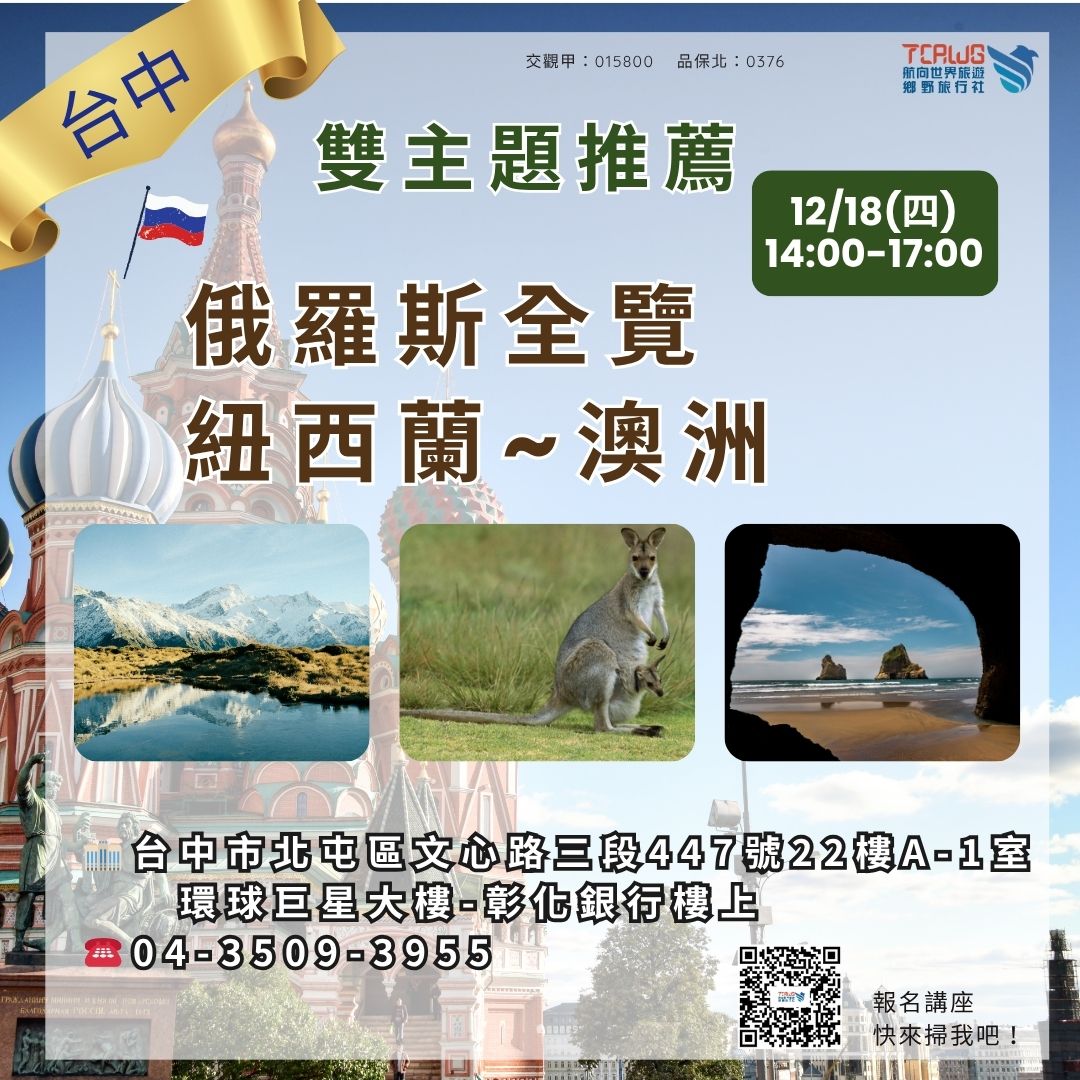 ✈️ 長線旅遊|俄羅斯全覽 × 紐澳推薦雙主題講座12/18(四)台中場|俄羅斯全覽推薦 × 紐澳推薦