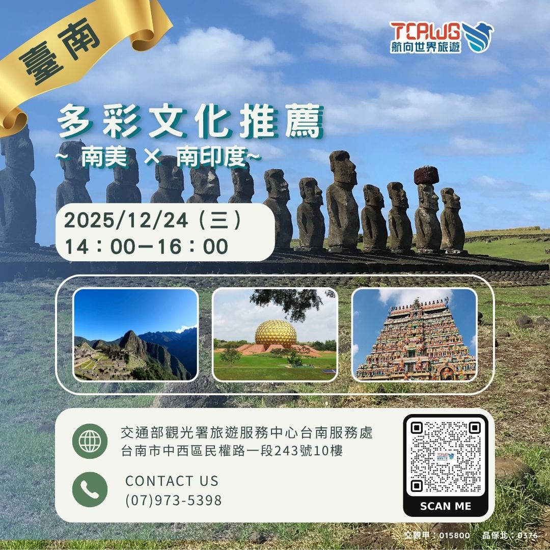 ✈️ 長線旅遊|多彩文化雙主題講座12/24(三)臺南場|多彩文化推薦:南美 × 南印度