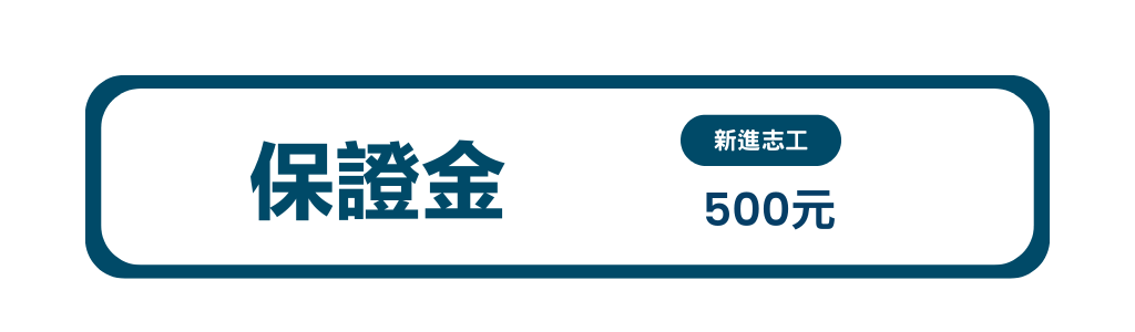 - 為有效運用志工單位資源,【當年度新進志工】面試通過後,須在指定期間繳交保證金500元。凡完成訓練並累計達服務時數10小時,於隔年度授證時退還。