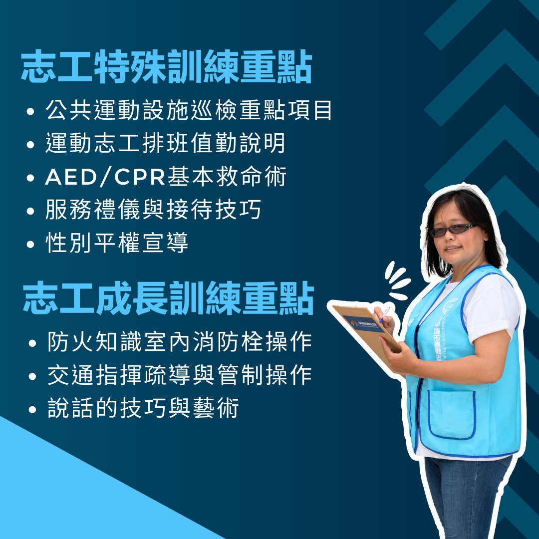 - 因不可抗力或其它安全因素,主辦單位得調整志工訓練內容,若有延期或取消,並於【臺中城市運動志工隊FACEBOOK粉絲頁】及【臺中市政府運動局官方網站】發布公告。
