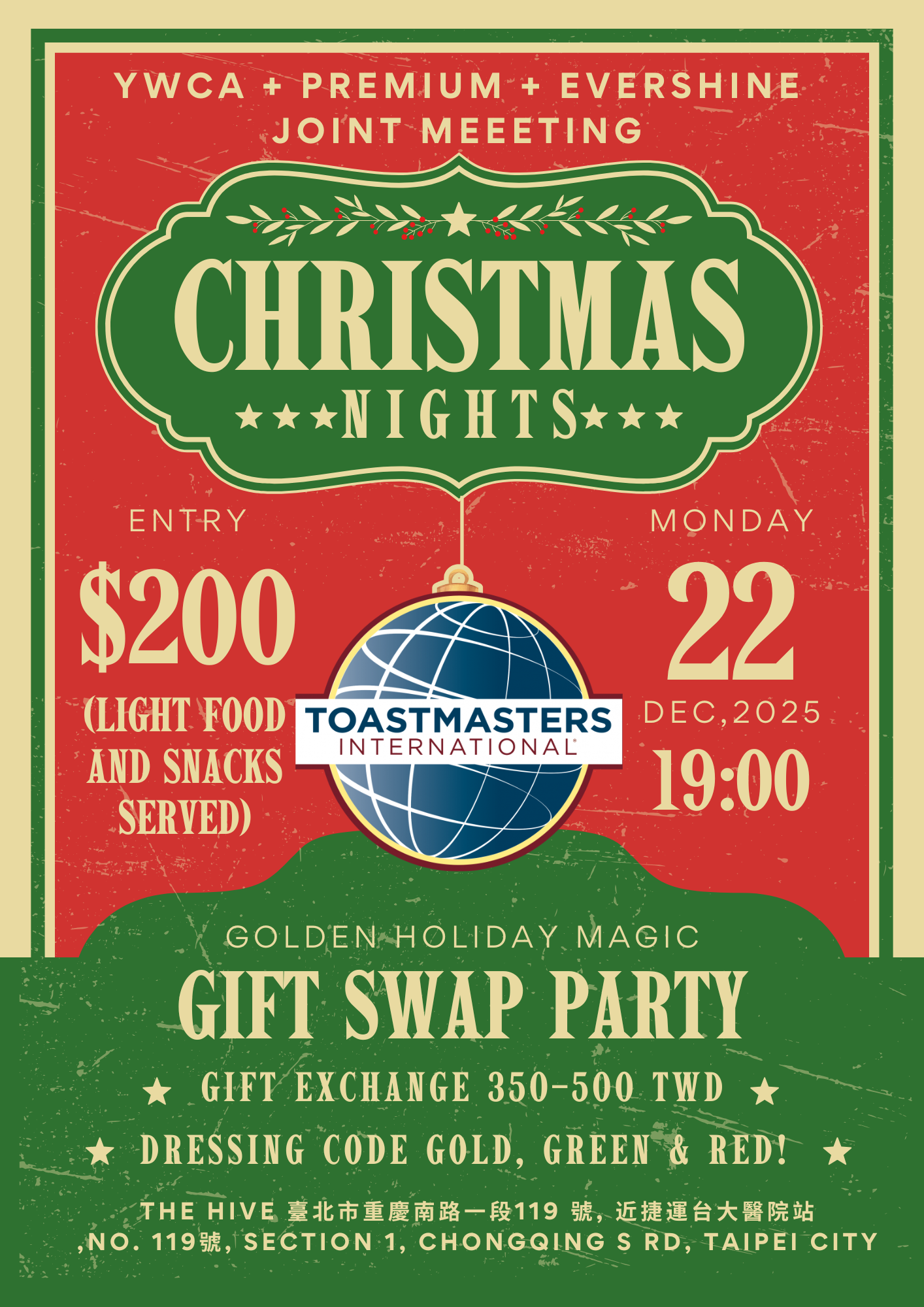 Join the festive fun! You're invited to the annual YWCA + Premium + Evershine Toastmasters Christmas Party & Gift Exchange! 🥳