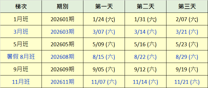 2026年開辦六梯次:1月班、3月班、5月班、暑假8月班、9月班、11月班。