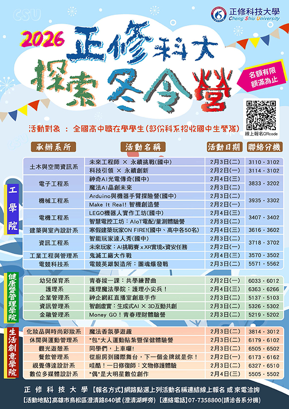 正修科技大學舉辦2026探索冬令營活動,"全程免費"