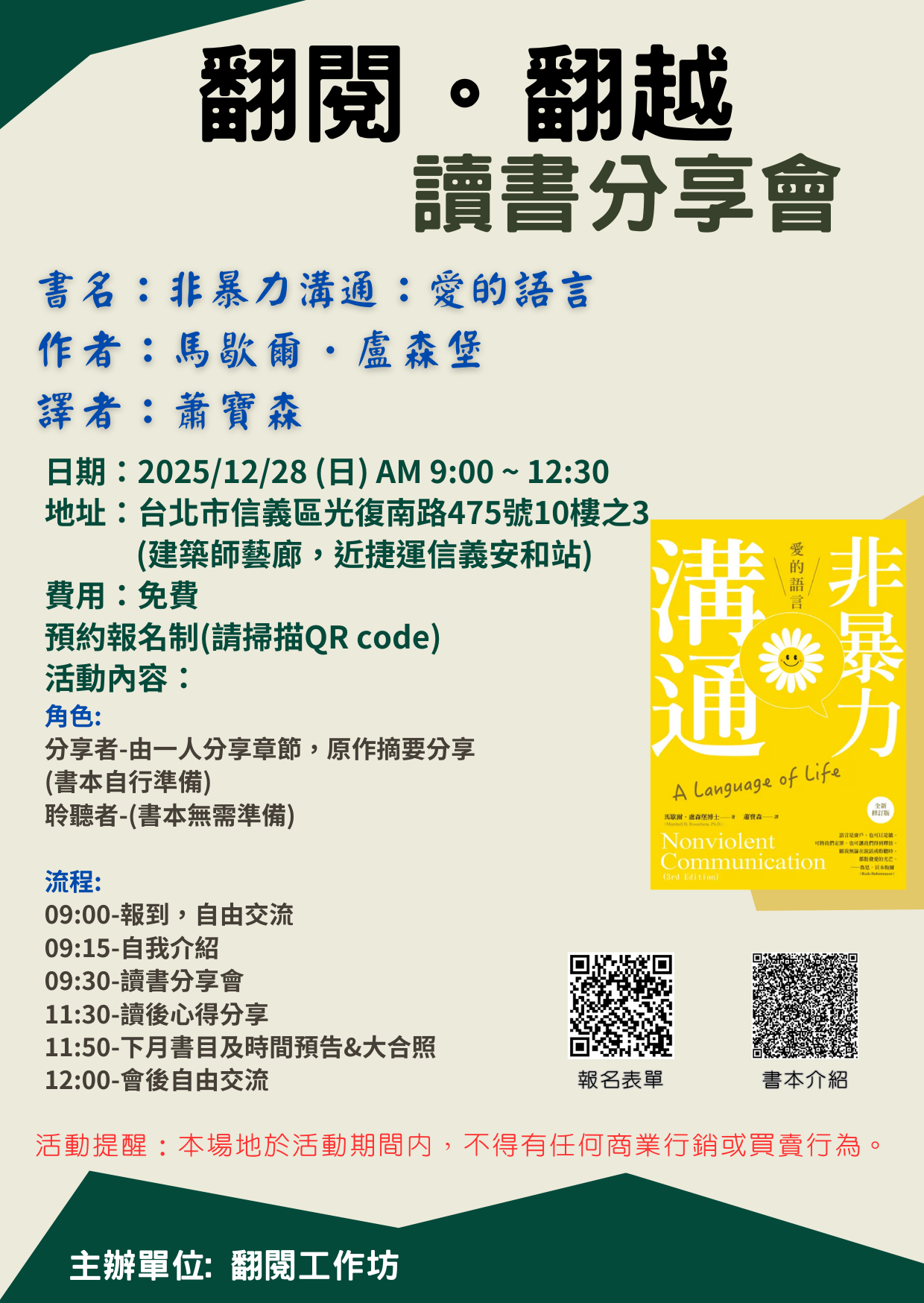 2025年12月份【 翻閱書本。翻越人生 】 翻閱工作坊 - 讀書分享會 想讀書,沒時間? 想成長,沒人陪? 我們是一群渴望成長、蛻變的同伴, 從每月共讀一本商管書籍出發, 透過【一人演講】或【多人章節均分章節】,原作摘要分享, 讓讀書更有效率,讓成長沒有惰性。