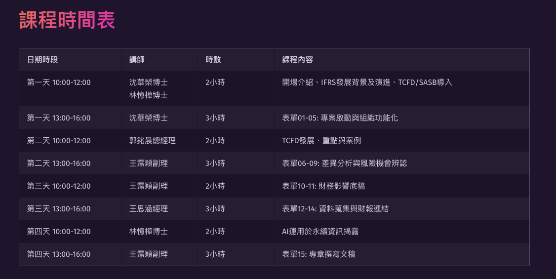 - 課程對象:符合金管會要求揭露永續資訊之上市企業永續長、負責人,以及任何有興趣了解之永續專業人士。