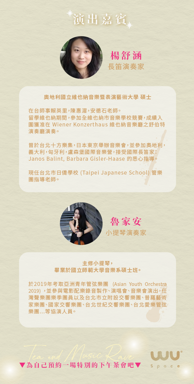 在長笛與小提琴的悠揚中,熱茶香氣與茶點甜韻交融。