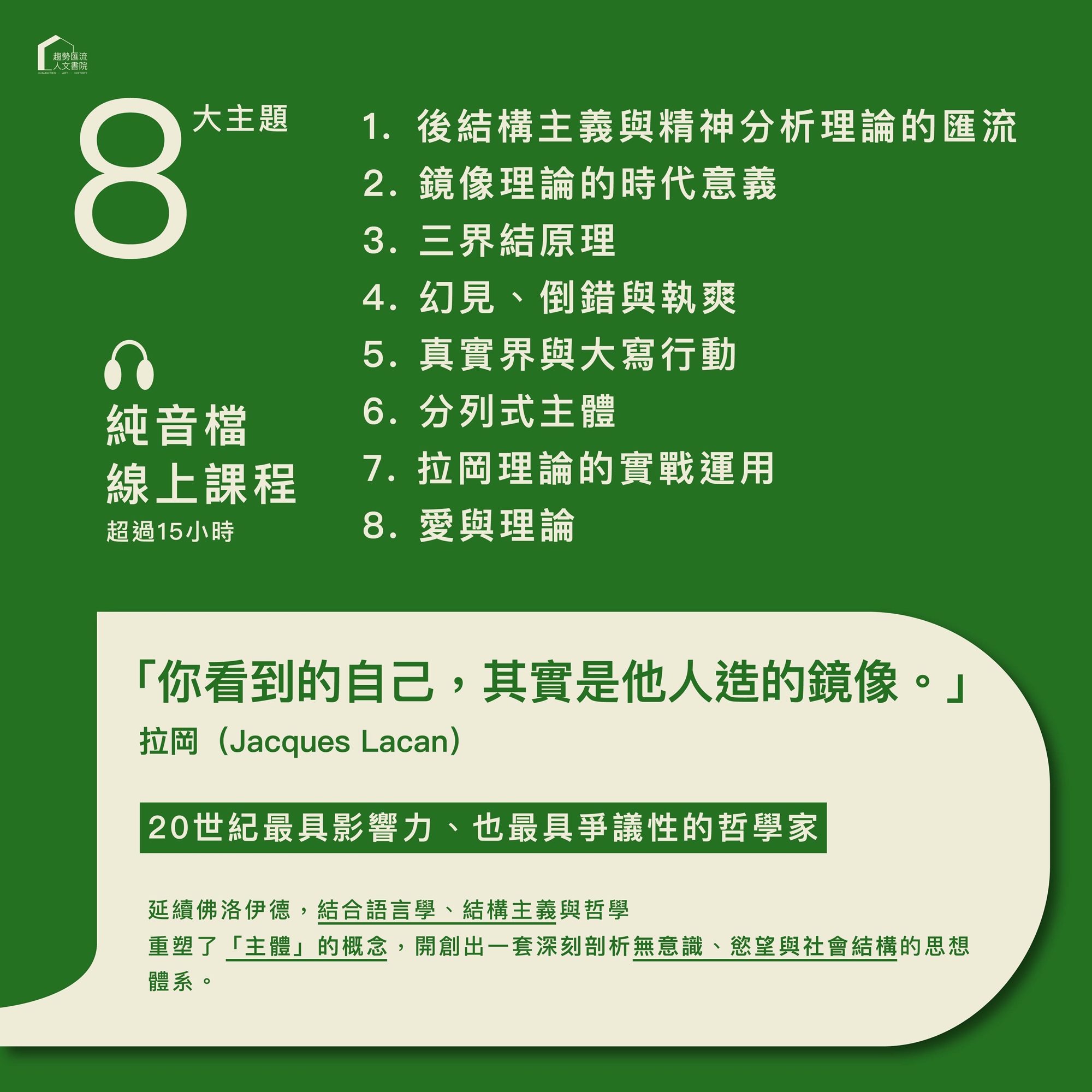 拉岡,二十世紀後半葉經典級別的精神分析大師,幾乎是佛洛依德與榮格之後最關鍵的精神分析理論體系的建構者,而拉岡體系的出現也標誌著精神分析理論的重要轉變,這位來自法國的哲學大師將精神分析從原先的心理治療移提升到更深澈的關懷,蛻變成一種對於現代精神文明的整體剖析。