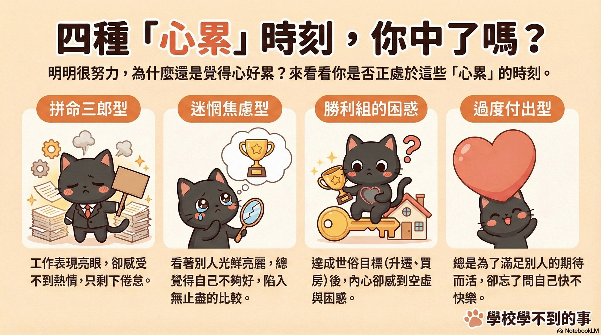 - 迷惘焦慮型: 看著別人光鮮亮麗,總覺得自己不夠好,陷入無止盡的比較與焦慮。