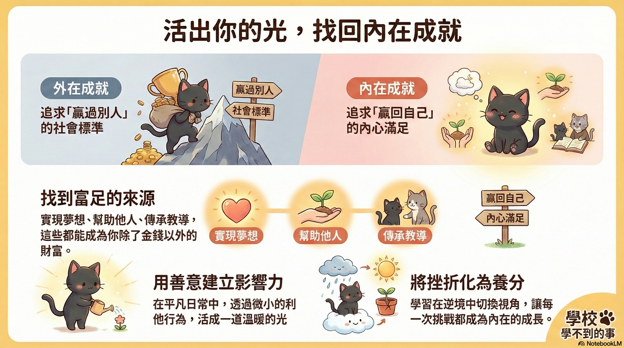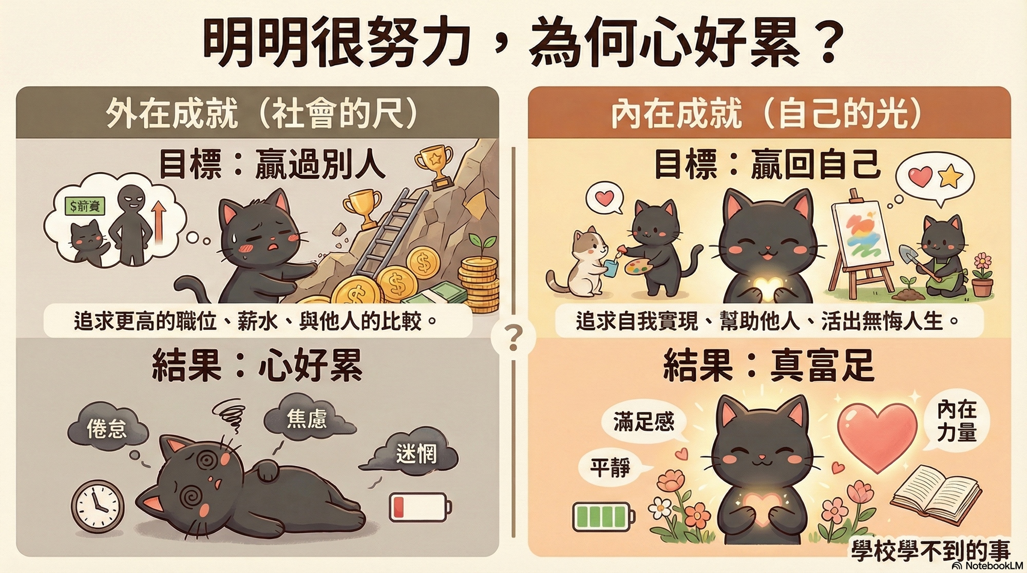 - 區分兩種成就: 理解「外在成就」與「內在成就」的差異,不再被社會標準綁架。