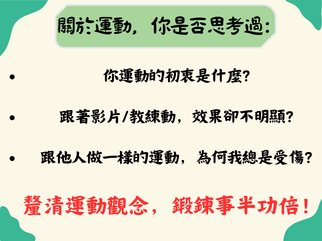 為什麼要運動? 增進健康、維持身材、比賽成績。 你運動的方式有符合你的目標嗎?
