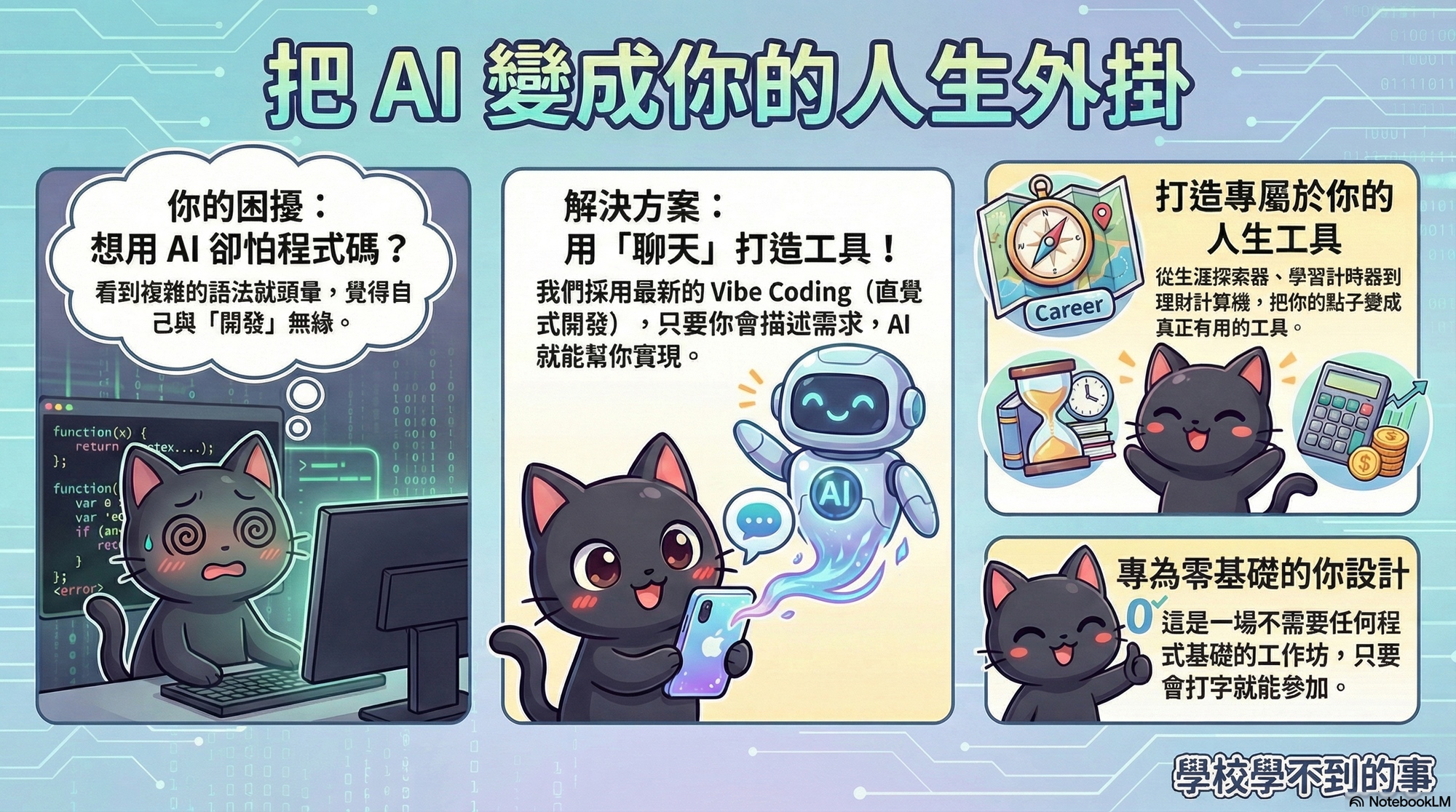 這是一場**「不需要」**任何程式基礎的工作坊。 不用專業的語法,只用最新的 Vibe Coding(直覺式開發)——只要你會打字聊天、描述需求,AI 就能幫你把腦中的點子變成真實可用的網頁工具!