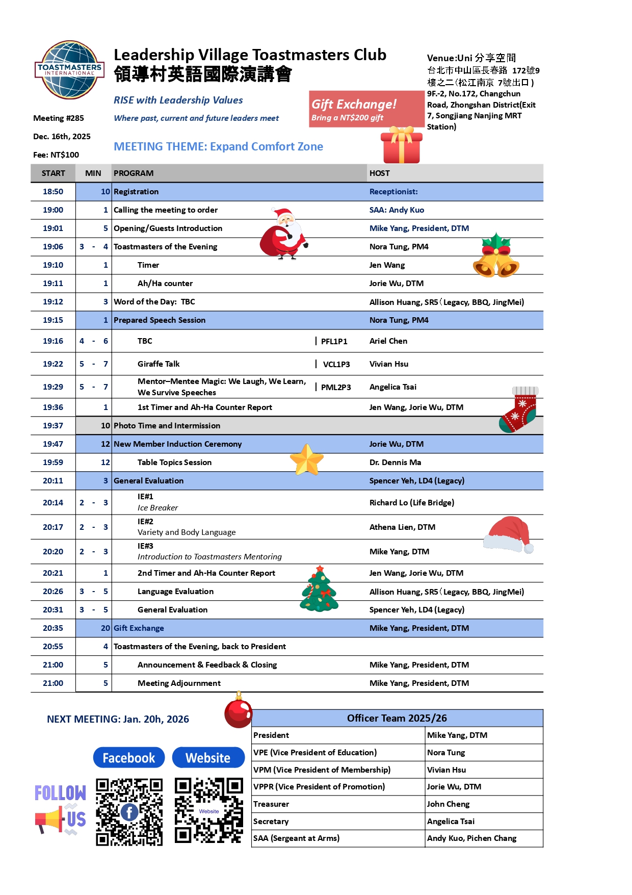 “在領導村國際演講社,我們將每月的會議轉變為溝通、反饋和自我成長的旅程。我們是一個相互支持的社群,在這裡,每個聲音都獲得信心,友誼蓬勃發展,每個成員都能發現內在的領導者。