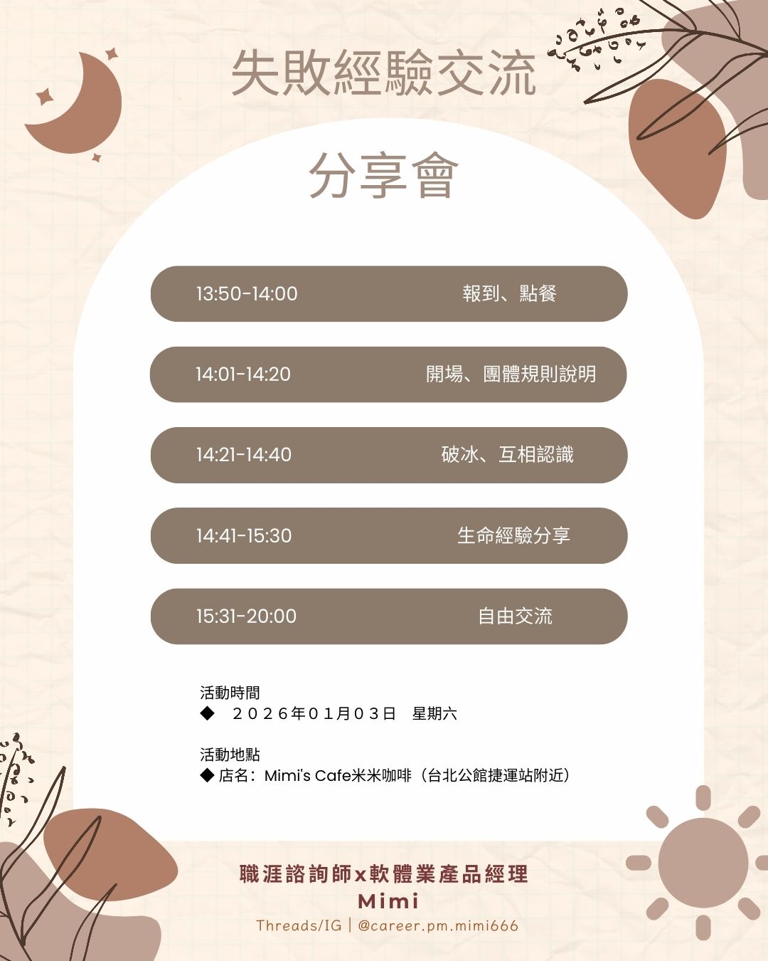 5.本活動藉由經驗分享,並彼此「交流、反思、回饋」來增加個人生涯規劃的啟發,並非「抱怨大會」,請留意!