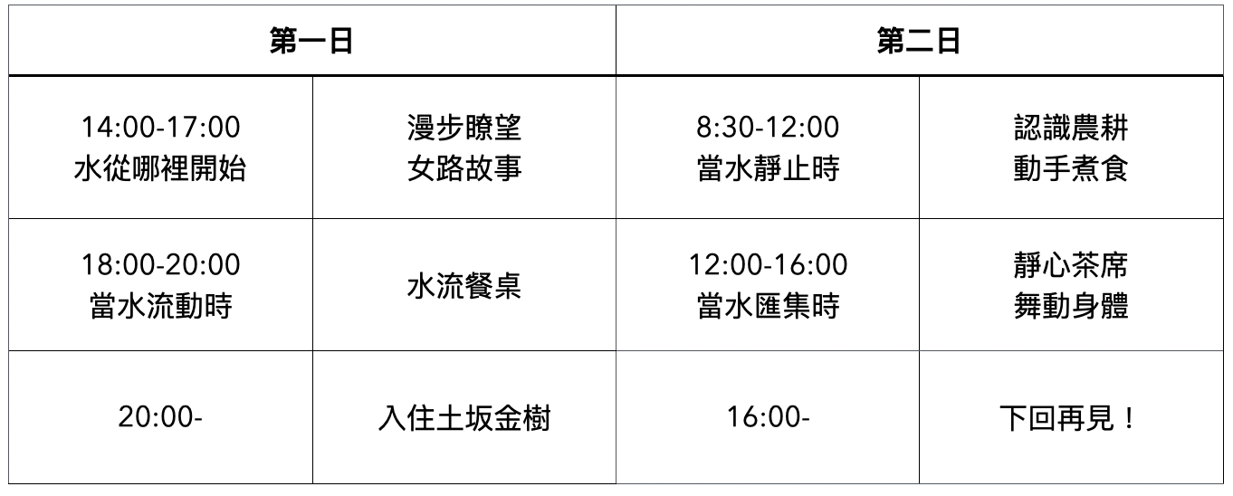 - 部分行程將於溪流邊進行,如不便坐於溪石上或於戶外吹風者請自行斟酌,或攜帶相關用品。