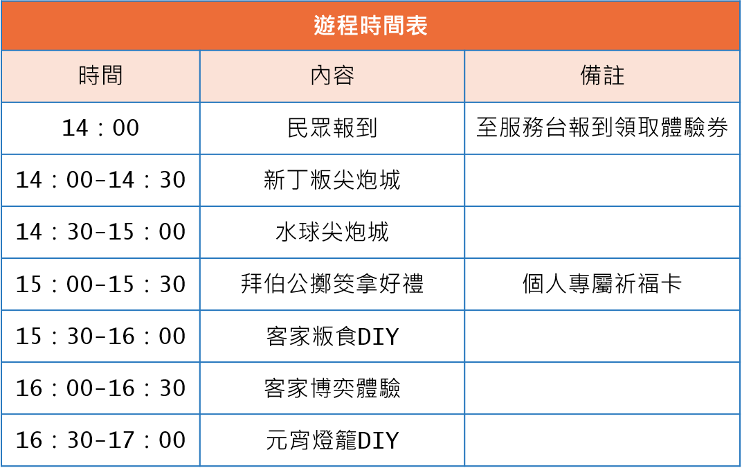 【遊程內容】新丁粄尖炮城、水球尖炮城、拜伯公擲筊拿好禮、客家粄食DIY、客家博奕體驗、元宵燈籠DIY