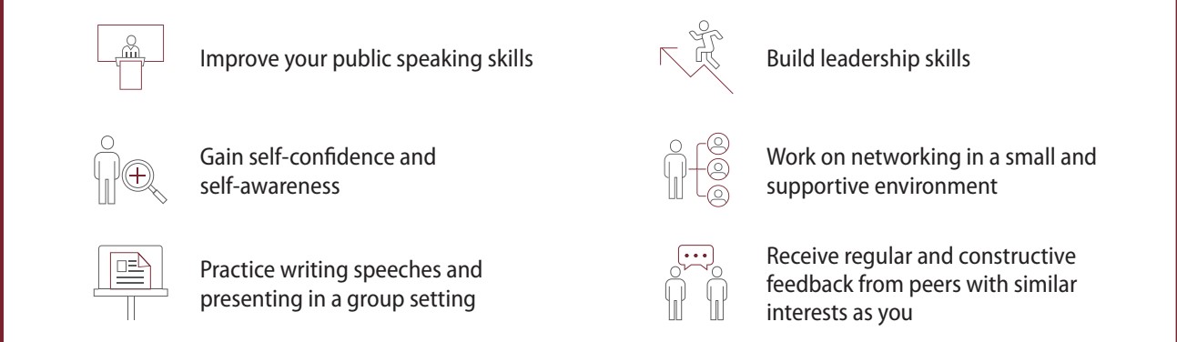 演講會將為你提供在任何情況下有效表達自己所需的技能和信心。無論您是成熟的經理、學生、年輕的專業人士、職業發展者還是希望對社區產生影響,Toastmasters 都是獲得良好溝通技巧的最有效、最有支持性、最愉快和最實惠的方式。您將提高人際溝通能力,並在演講時更有說服力和自信。