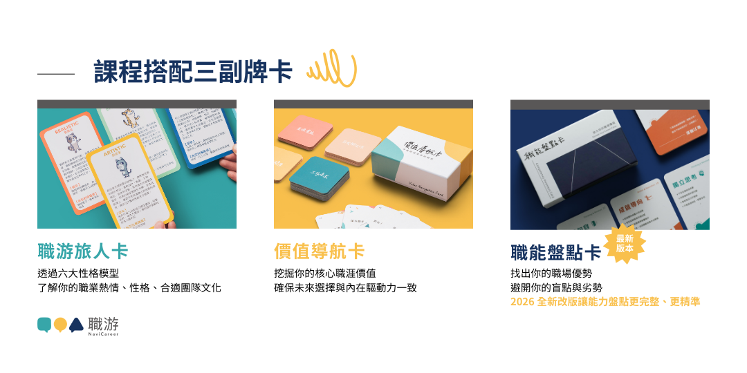 每位學員將實際操作職游團隊研發的三套專利工具——價值導航牌卡、職游旅人牌卡、職能盤點牌卡。