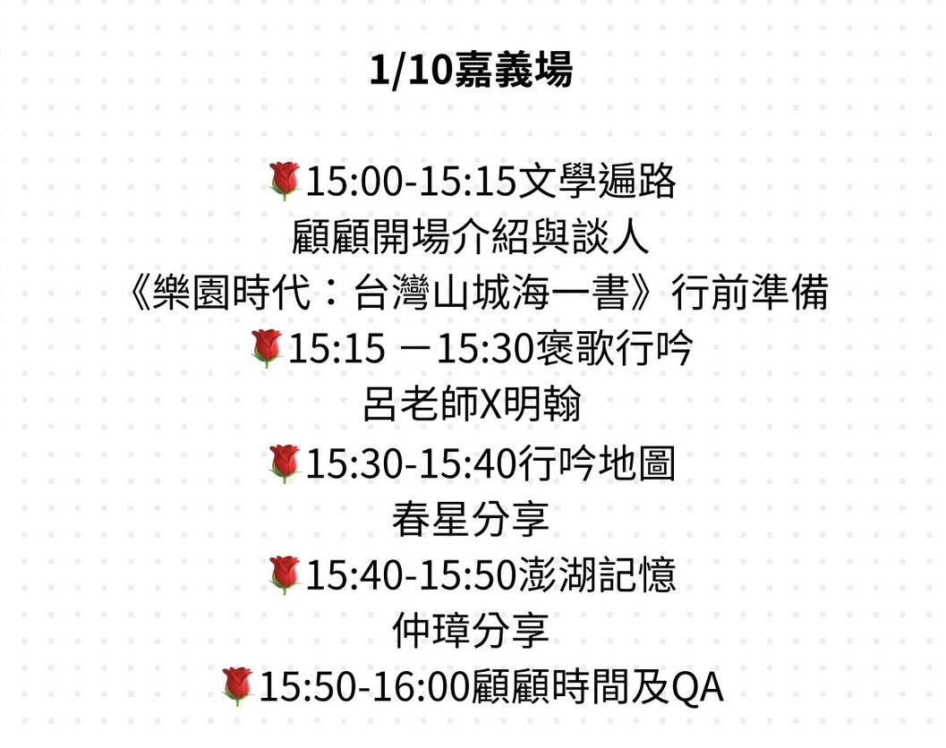 把南方四島裝進一場夜晚。沿著「好漢之路/手作之路/寂靜之路/啟明之路」,與自我對話,作者顧蕙倩踏訪西嶼坪嶼、東嶼坪嶼、西吉嶼、東吉嶼,將詩、影音與田野筆記編織成一段關於海與聚落的記憶修復。這不是一般的新書說明會,而是一場把「島嶼如何被看見」化為現場體感的文學展演。