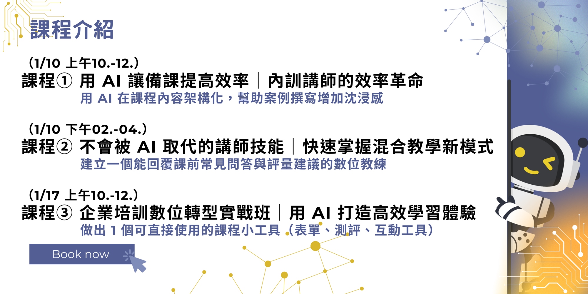 參加者將帶著清晰的工作流程與可直接使用的工具模板離開課堂,課後即可套用到現有課程之中。
