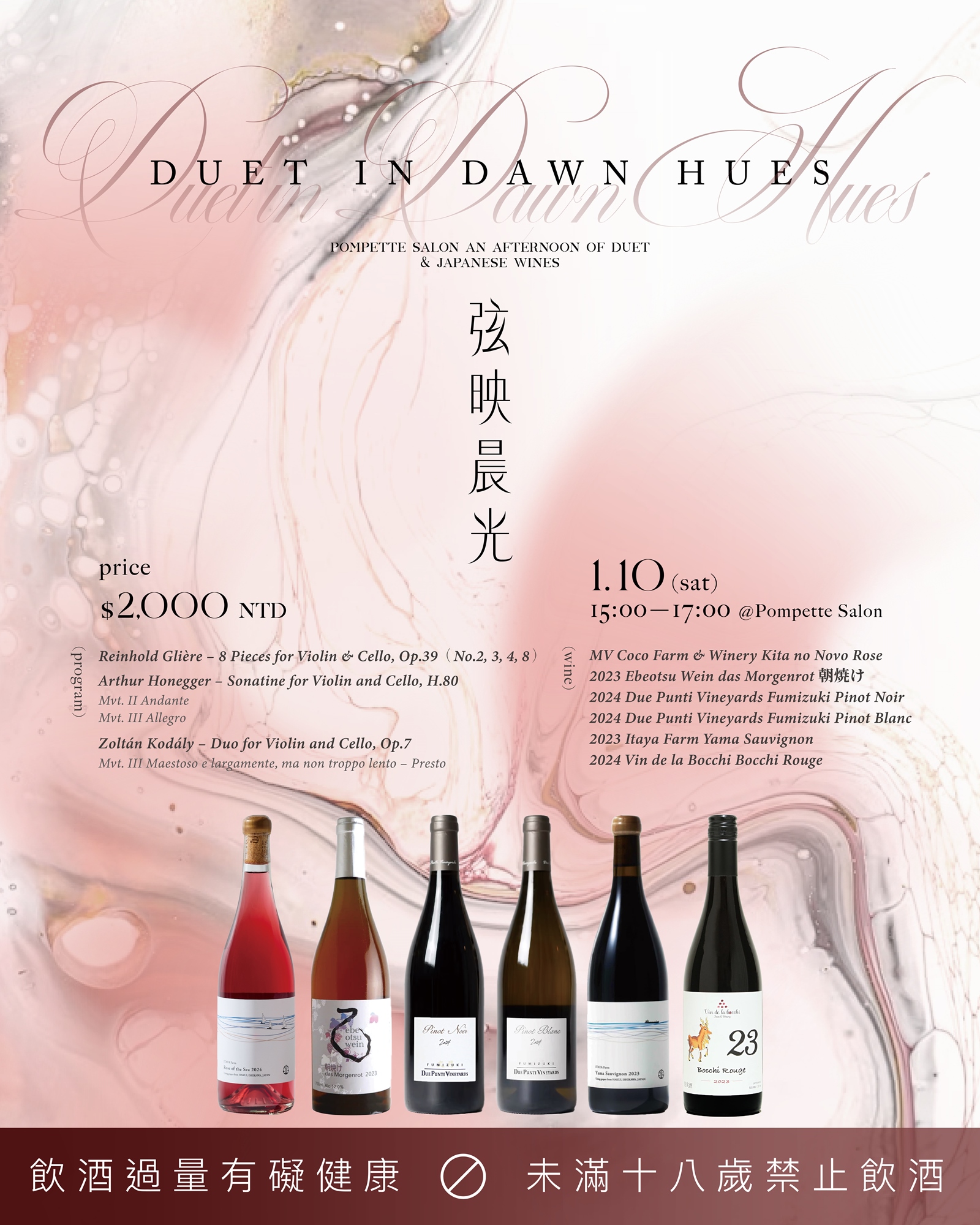 透過格里埃爾的輕巧篇幅、奧涅格明朗的光影對比,以及柯大宜作品中的張力與開展,共譜一條從細膩到明亮的音色軌跡。而日本酒款所具備的清新、克制與風土細節,則使旋律得以在香氣中延續與擴散。