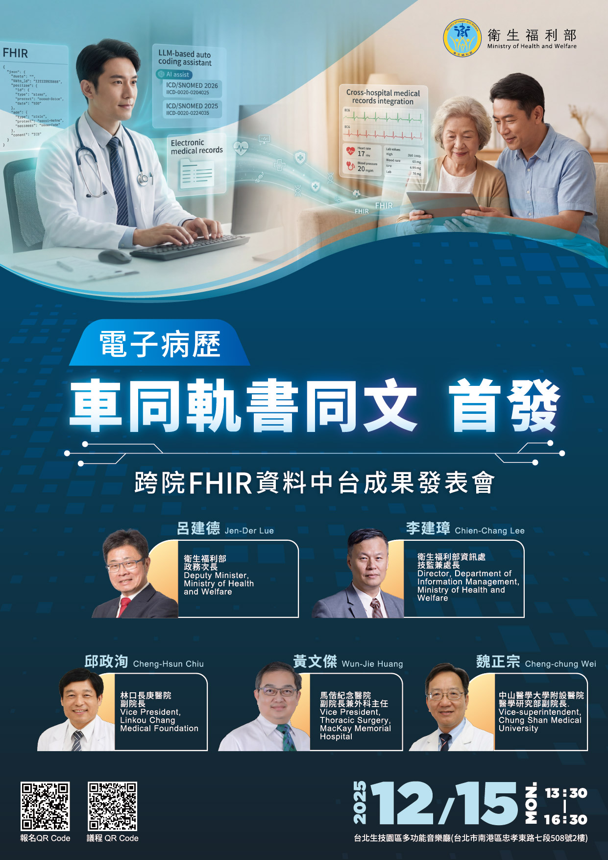 本部與專業團隊經常經規劃與嚴謹技術驗證,成功建置了跨院FHIR資料中台,將原始病歷資料轉換為國際通用的FHIR 格式,大幅提升電子病歷資料交換能力!標誌著全國醫療資訊共享合作向前邁進的關鍵一步!誠摯邀請各界夥伴共同見證此項重要的創新里程碑,並參與未來推動藍圖的啟動儀式。