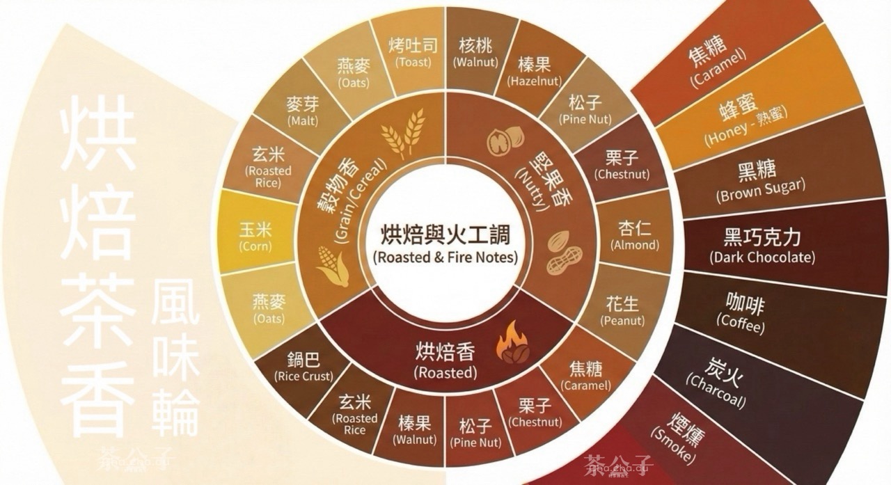 這些香氣通常來自茶葉製作過程中的殺青、乾燥或烘焙(焙火)階段,主要由「梅納反應(Maillard reaction)」與特定化學物質(如吡嗪類 Pyrazines)所產生。