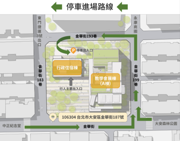 - 政治大學公企中心付費停車場:由金華街199巷(單行道),左轉金華街193巷(單行道)進入