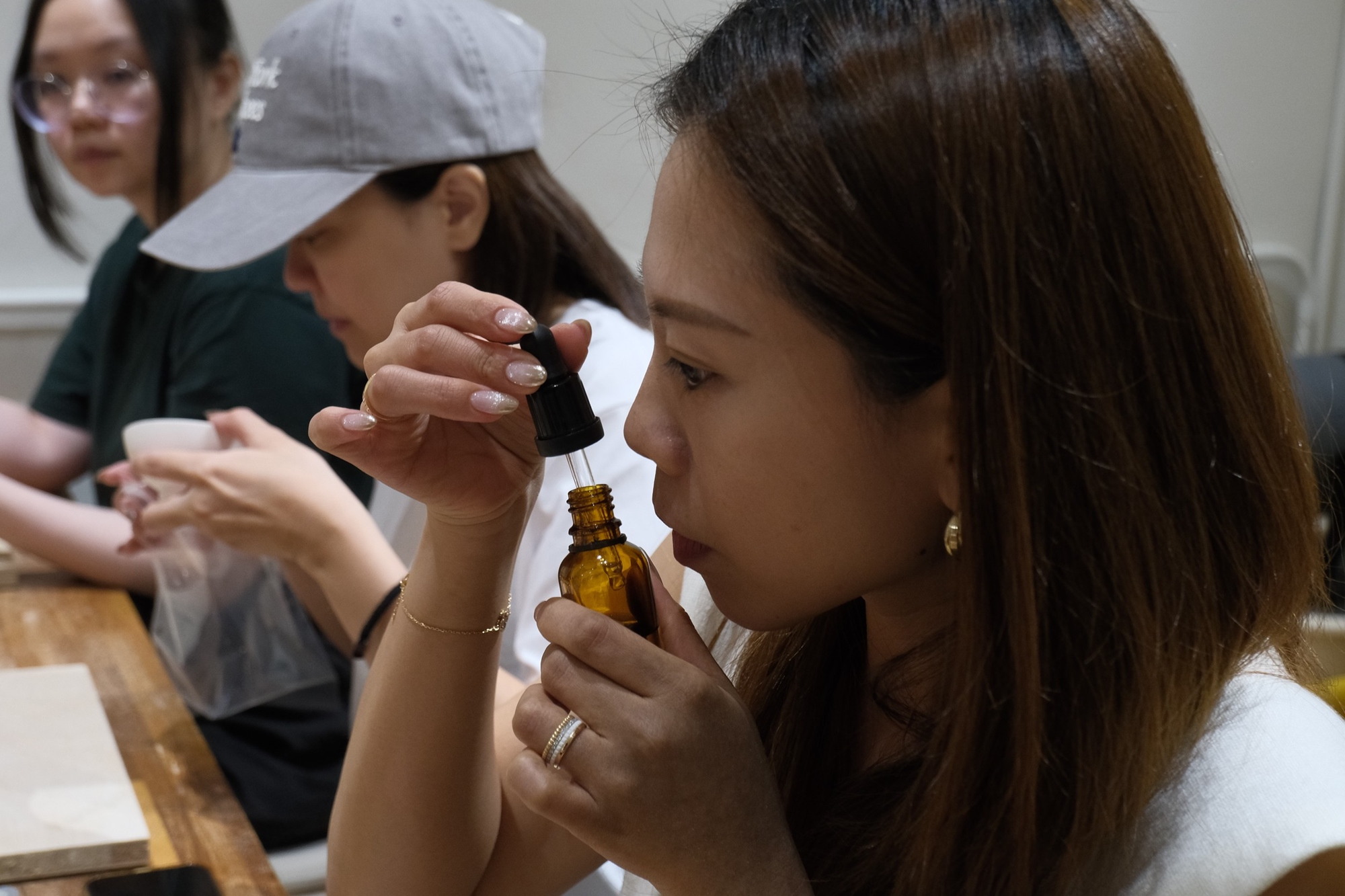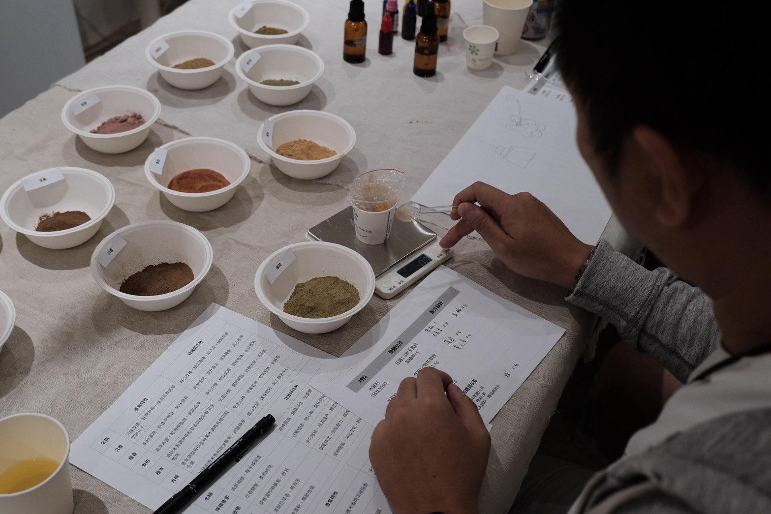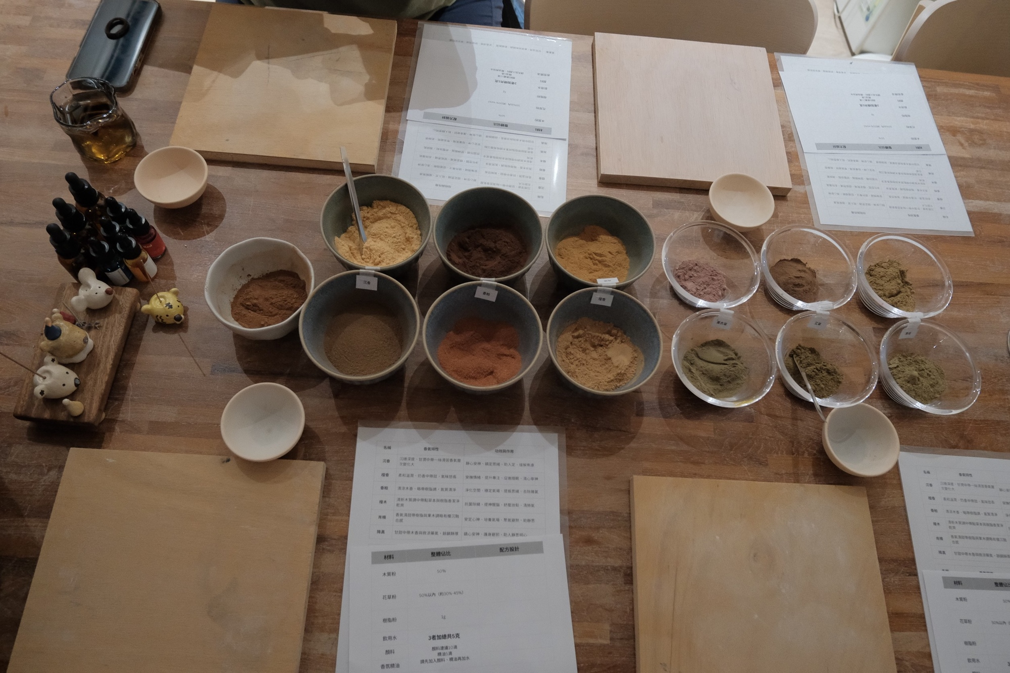 將近二十種天然香材(如檀香、香柏、薰衣草等)提供選擇,嗅聞並學習香材屬性及配香比例,從零開始打造出個人化香方。