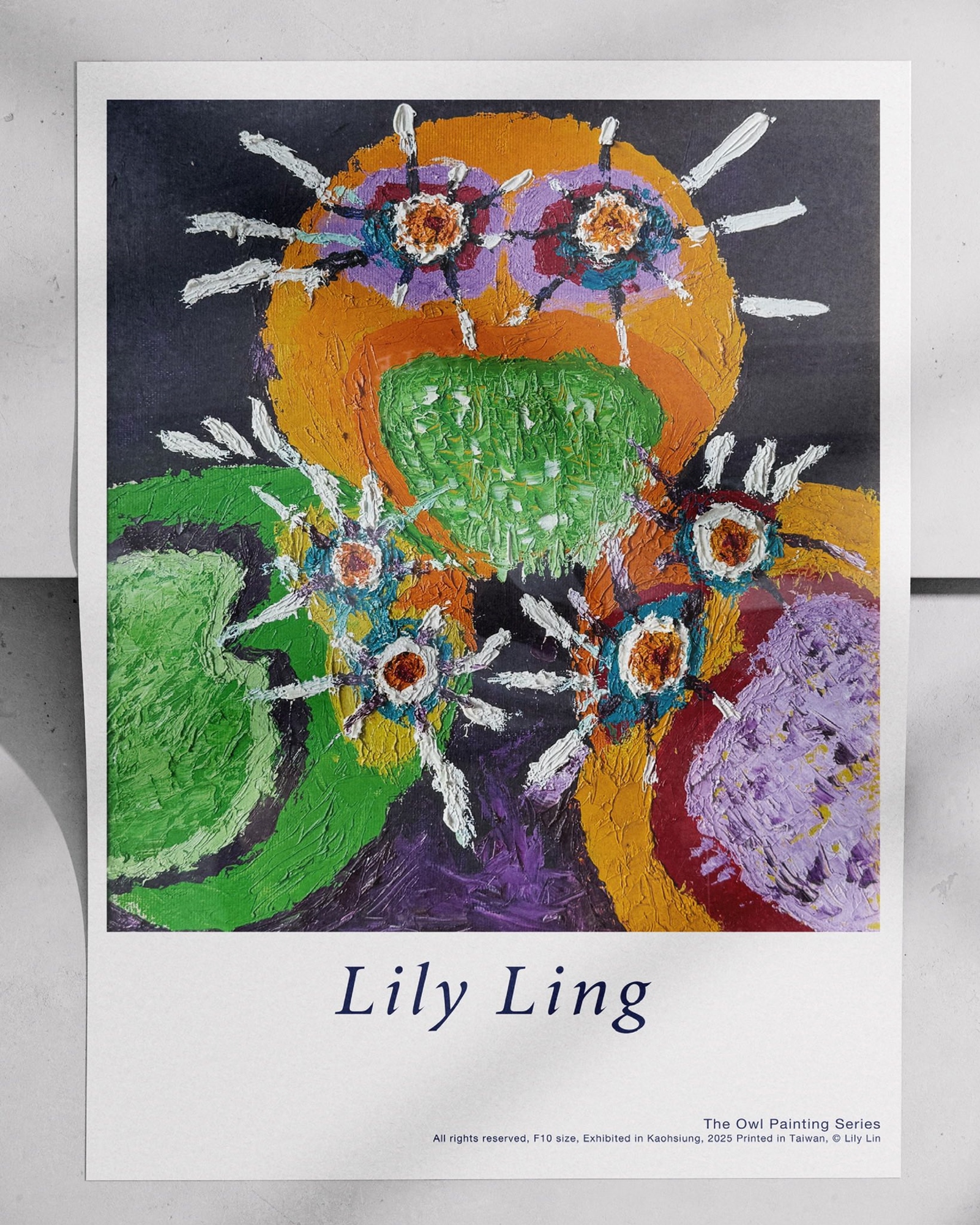 擅長透過自由、偏移的線條建立獨特的視覺畫面,並以「保持可愛就好了」作為創作哲學。Lily 為中度智能障礙、染色體異常者,畢業於美和科技大學幼保系。近年來,她持續為畫中添加幽默,她的貓頭鷹系列作品逐漸受到國內外觀眾的喜愛。其作品曾展出於 ARTe Kunstmesse Wiesbaden、德國康士坦茲國際藝術博覽會、ART INTERNATIONAL ZURICH 瑞士藝術博覽會等國際藝術展覽,亦受國泰人壽等企業邀請展示。