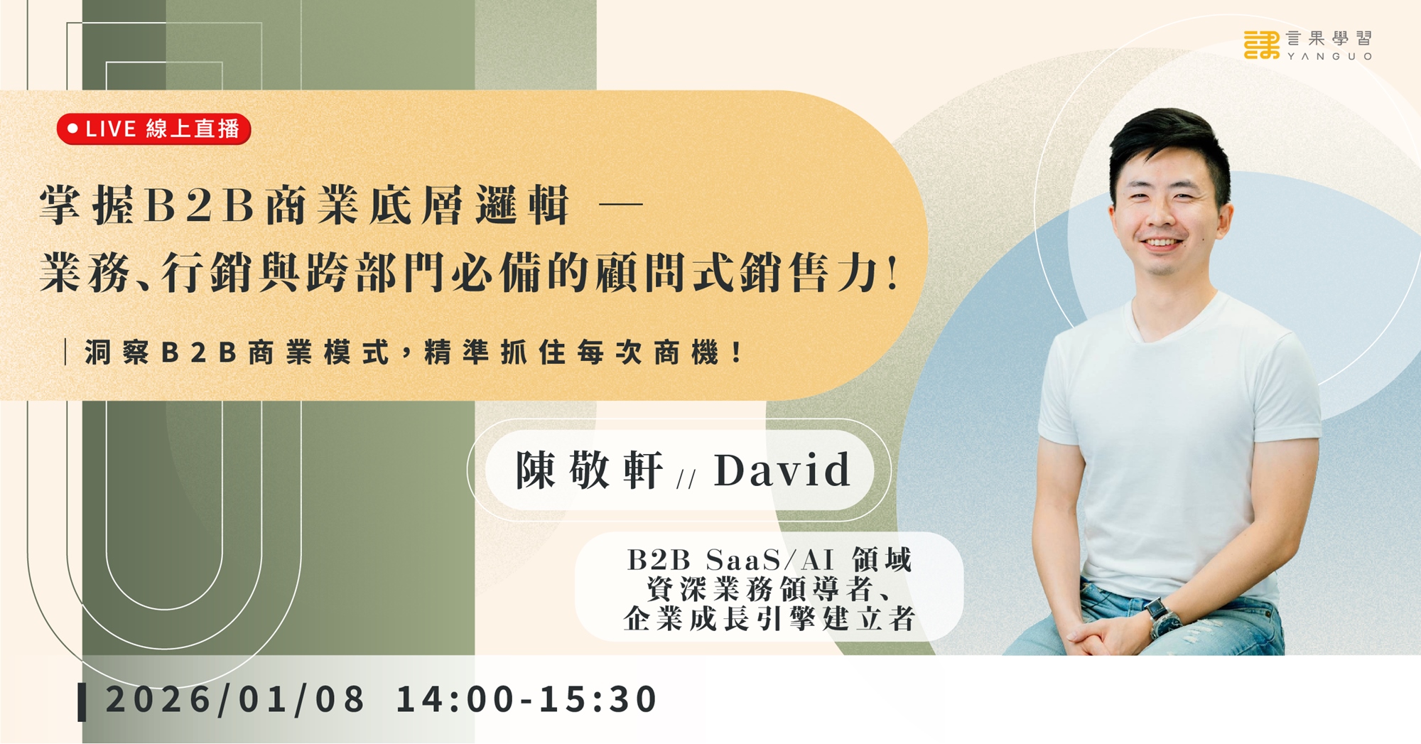 本場講座特別邀請 B2B SaaS/AI 領域的資深業務領導者 ── 陳敬軒 David 老師,帶你理解「顧問式銷售力」的核心原則,從五個桶子理論展開,接續談到以好奇為起點的需求探索,到商業底層邏輯解析,並分享如何透過三項關鍵工作習慣,快速養成顧問式銷售力。只要您的工作與企業客戶往來相關,都能在課程中學習如何有效看懂客戶、掌握合作節奏,以更專業且有效的方式推動專案與,為企業、為自己、為客戶同時創造長期價值!