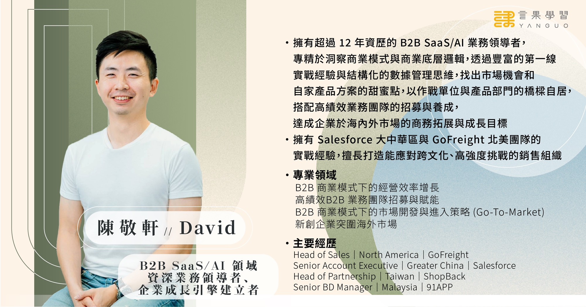 B2B SaaS/AI 領域資深業務領導者與企業成長引擎建立者 — 陳敬軒 David 老師