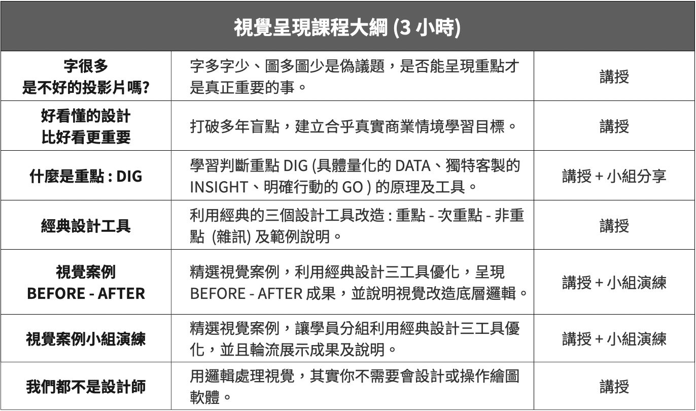 2.講師可能會從學員提供的簡報中,挑選部分投影片作為視覺呈現環節的上課案例,若您的簡報不方便公開,請於填寫報名資料時勾選「不提供簡報案例」。