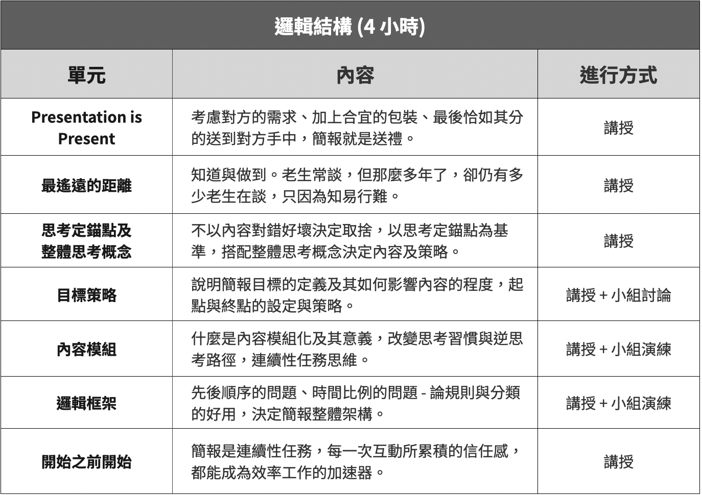 1 月 10 日的兩門課程,是各 3 小時的主題式課程,讓有需要的學員,針對「邏輯結構」與「視覺呈現」來強化學習。