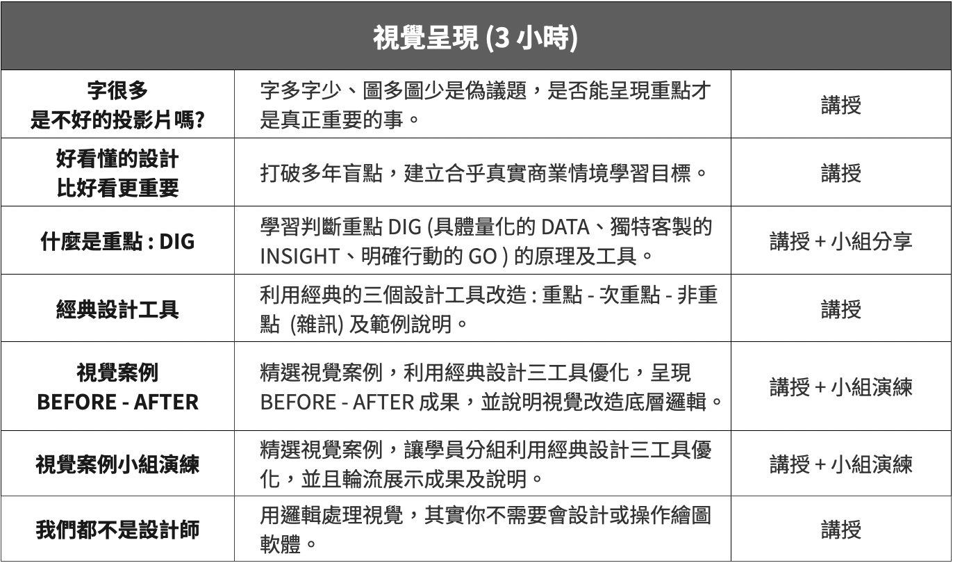 我們清楚大圖大字的簡報方式並不適用於真實職場,這門課程以職場人士真實的工作場景為核心,專注在策略思維、邏輯結構及能清楚看見重點的視覺呈現,提供在工作中立即可落地實踐的方法。